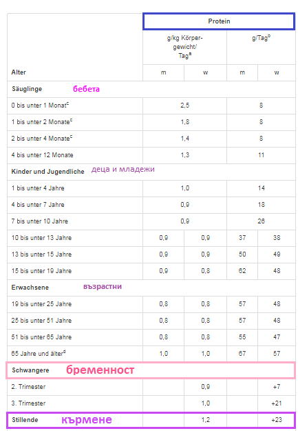 Ето една табл. с минималните кол-вата протеин (грам /на кг./тт ,на ден), които трябва да се приемат за здраво тяло. ( като това не се отнася за спортисти и т.н.)