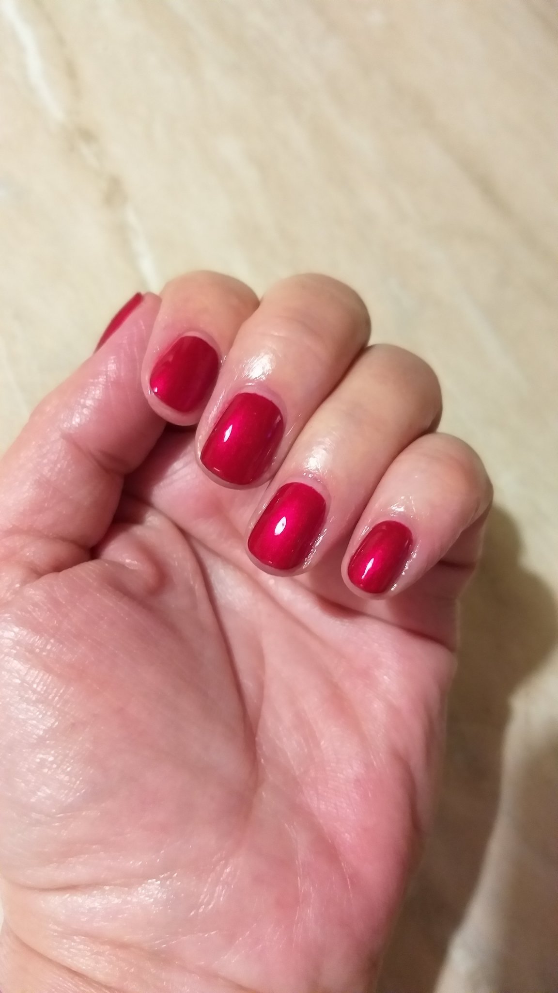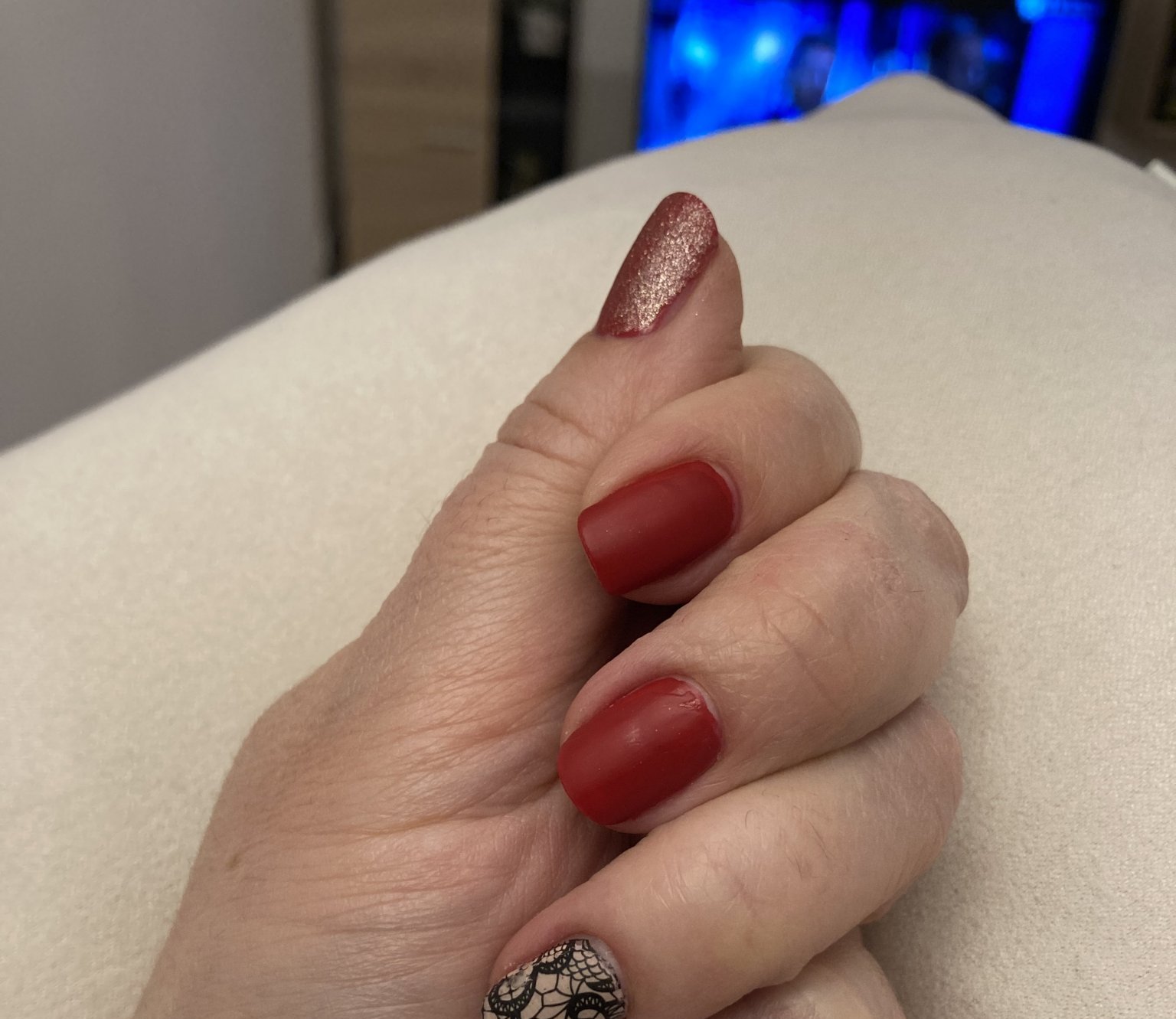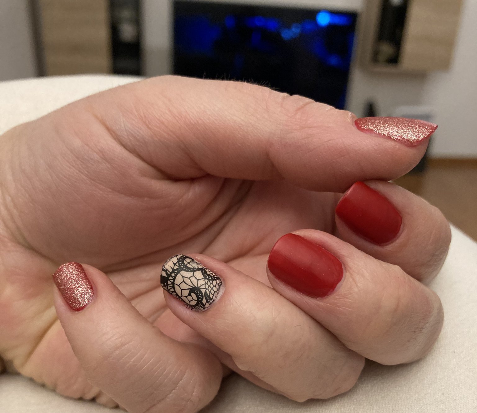 Аз направих уникална красота и за пръв път от ученическите години успях да съсипя 4 нокътя едновременно. Изтрих, остана само ваденката и наново, но с други цветове. Предните три метнах в коша. Не понасям бавно съхнене на нокти и декорации. Та сега така и нещо не се възприемам с червено. А обичам ноктите си до дъно като сега и в наситен цвят.