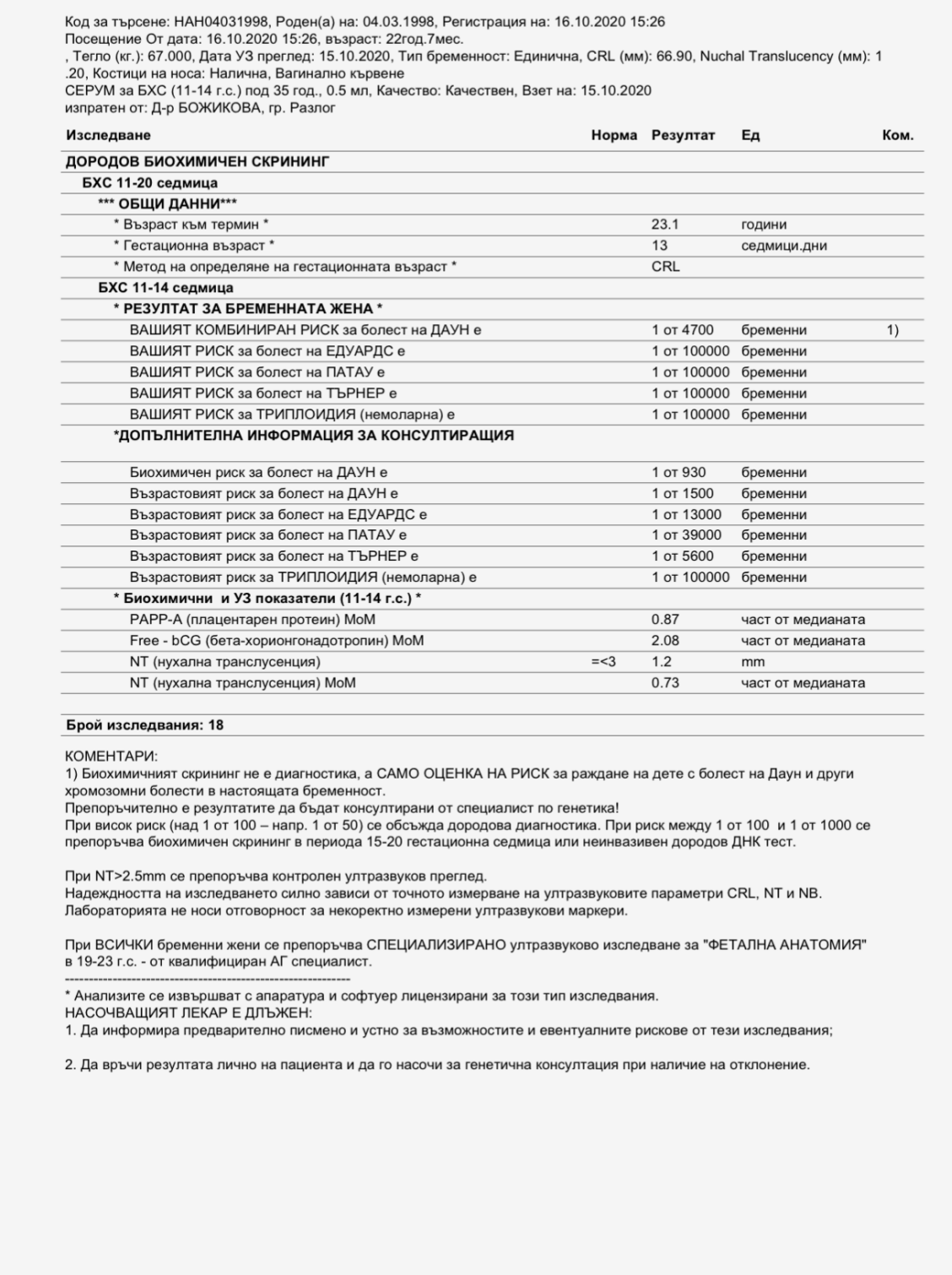 Днес ми мина ФМ при Чавеева, доволна съм. Спазиха часа за моя изненада, въпреки че имаше чакащи жени пред мен, ме извикаха в точно толкова часа, за колкото бях записана. Прегледът продължи около 40 минути, тя изглеждаше много съсредоточена, внимателна и компетентна. Резултатите са ОК, много нисък риск за хромозомни аномалии, което си знаех от генетичния тест, изненада ме и ниският риск за прееклампсия, за която много се притеснявам. Самата аз съм родена много преждевременно заради бързо развила се еклампсия при майка ми и кръвното ми е по-високо от началото на бременността (преди беше ниско, сега за първи път виждам трицифрено число за систолично налягане, което е в границите на нормалното, но все пак за мен лично е високо). Ще го обсъдя и със следящия ме АГ за евентуална терапия с ниска доза аспирин. Планирам и следващата ФМ да бъде при нея.