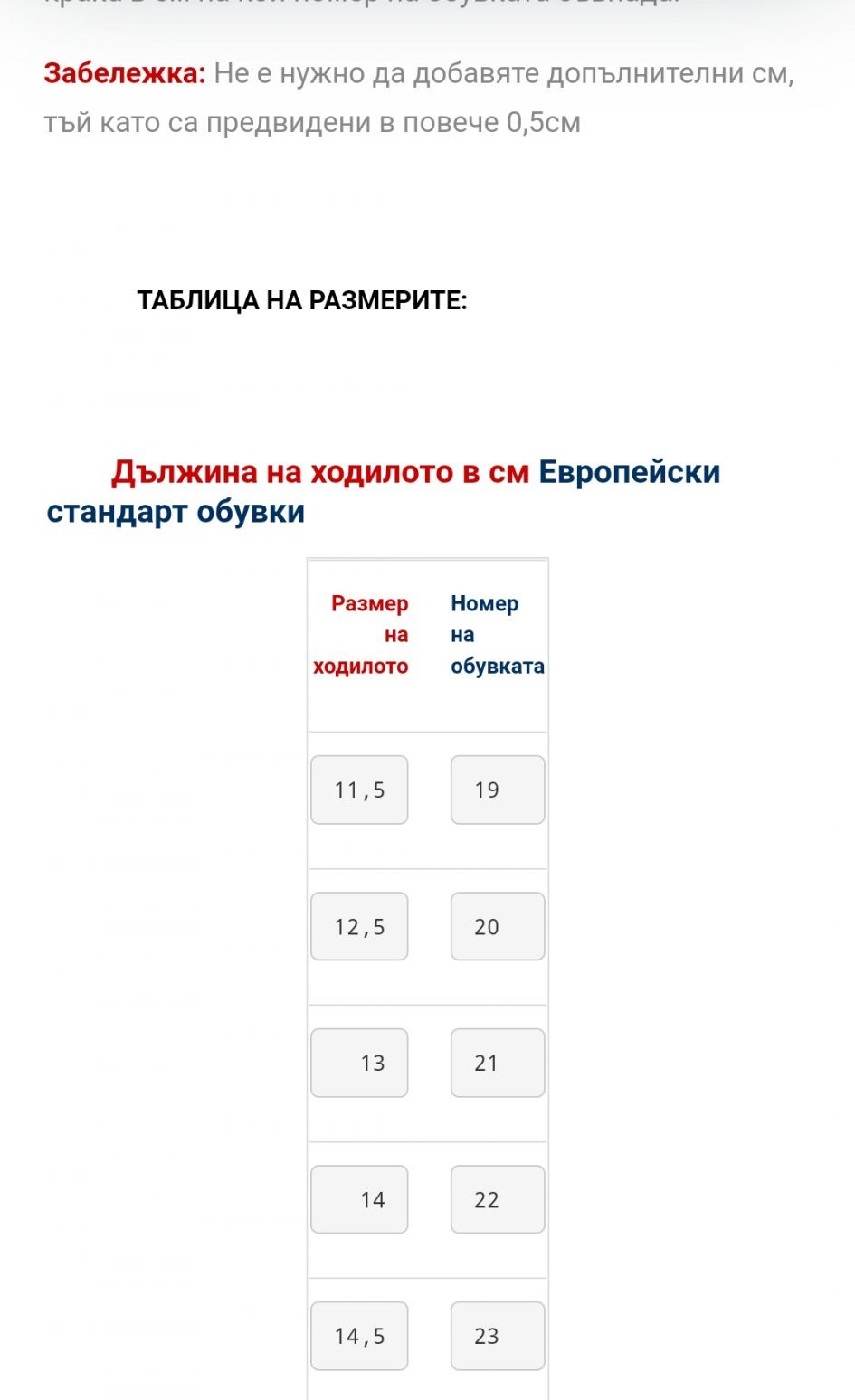 Не, крачето му е около 14,1см. Пак ще меря де. Затова се чудя 😁 тоест ако на 23 номер са добавени допълнително 0,5 см, излизат общо около 15 см. Ама май те ще са.