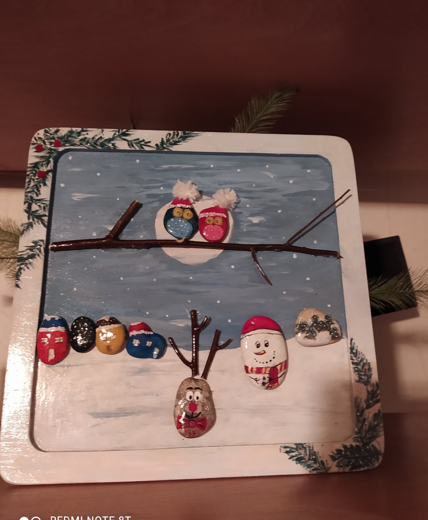 И мен ме впечатлява картината с камъчетата - много ми е уютна! Бих пробвала как ще стои едно подходящо парче борова кора, боядисана в бяло под къщичките, като някаква основа за тях, но и така е много хубаво!