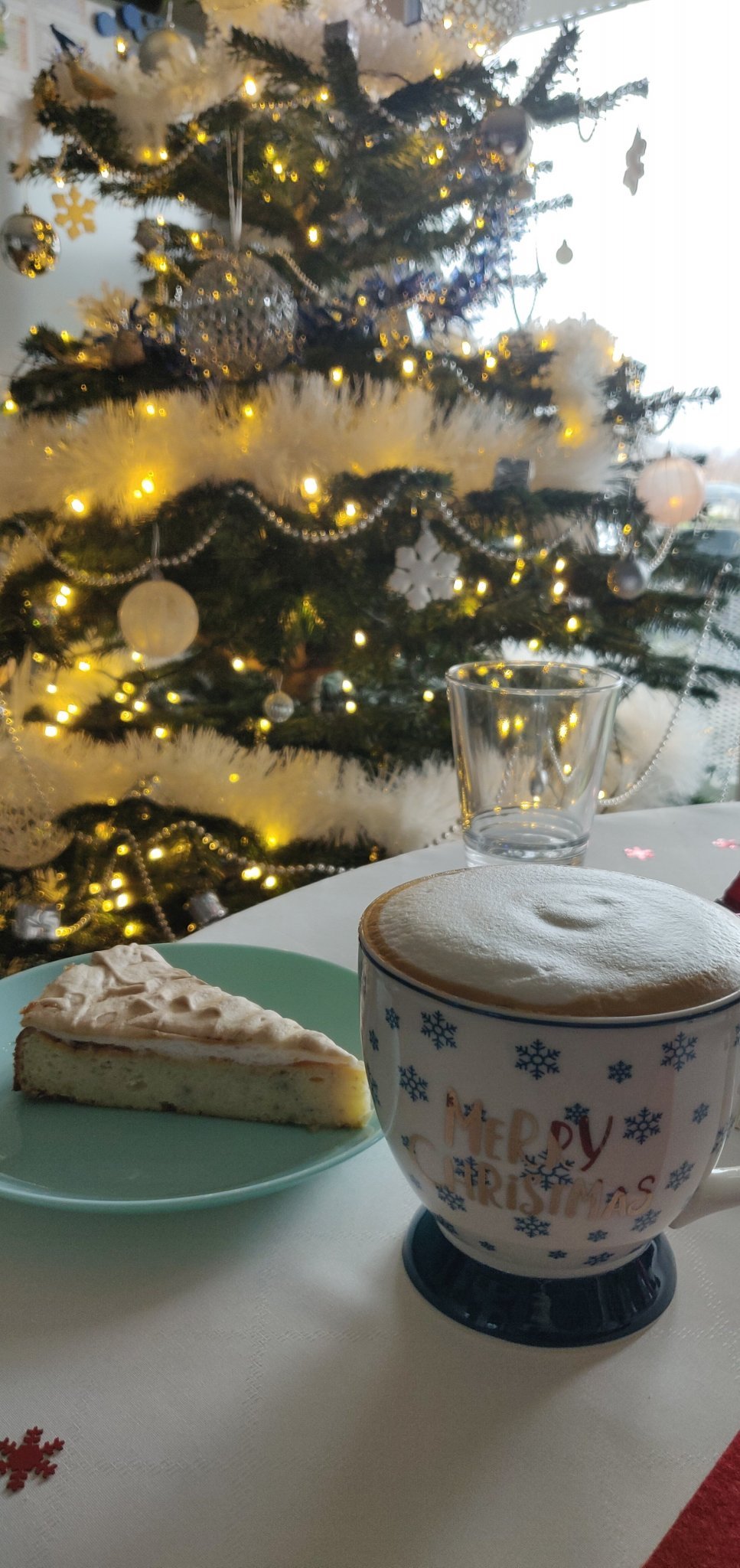 Поздрав със закуската - капучино и чийз-десерт с боб тонка и белтъчна глазура (свободни съчинения с няколкото останали белтъка от коледните сладки, няма да ги хвърляме, я 😃).