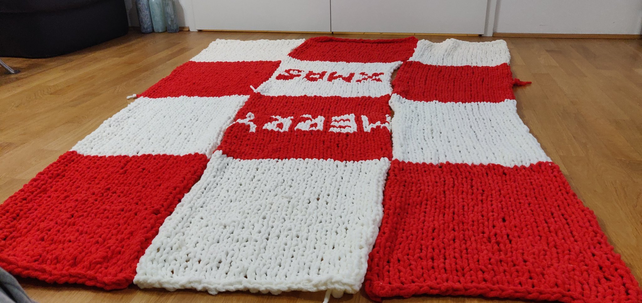 Аз завършвам вече. Всичко е оплетено, че даже и надписче си направих. Остава да съединя трите "шала" и да махна тези възелчета. Много е елементарно, но ми е съвсем първа плетка и го направих както можах. Стана бая голямо - 2м х 1,55м. Flushed Ще покажа накрая и в готов вид, че така надписът изглежда несъразмерен, а като се опъне, стои по-добре и си е в средата.