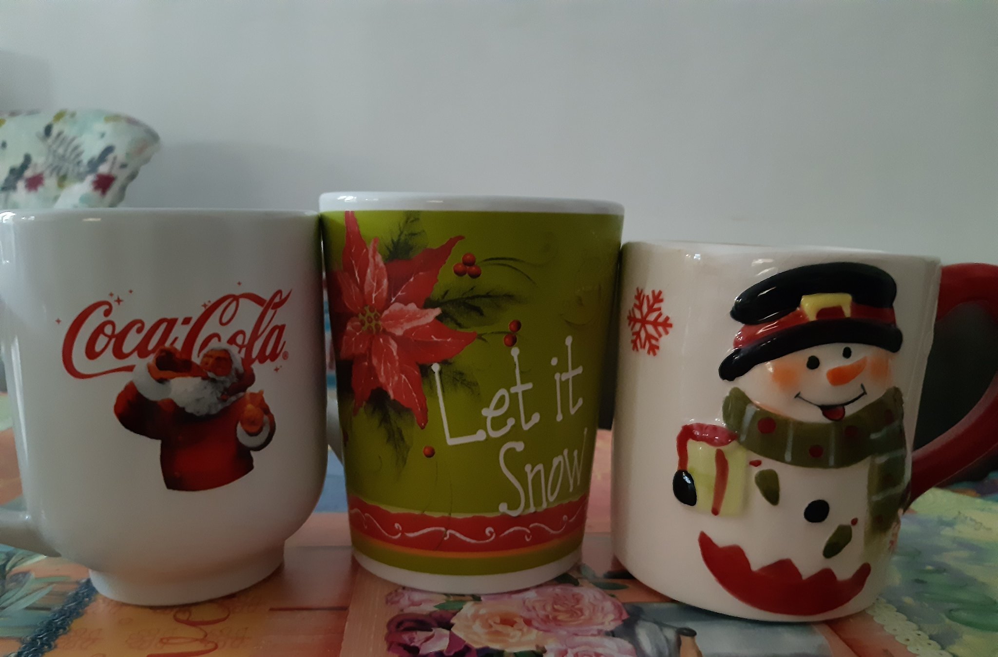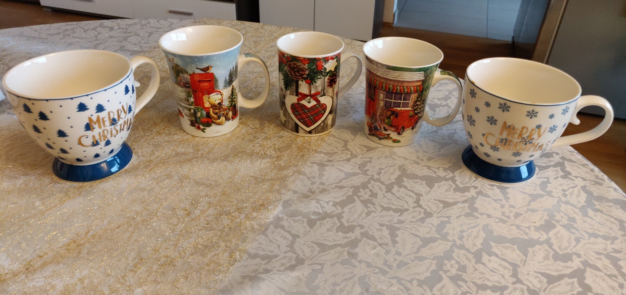 Ето ги и моите коледни чаши, които са достъпни в момента. Средната я раздаваха по Коледа преди 2г в местната аптека Flushed, следващите две са от майката на моя приятел - този английският порцелан, който се продава в едни красиви кутии, а външните две ми донесе милото, когато един ден казах, че искам ГОЛЕМИ чаши, за да събират МНОГО горещ шоколад. 😃