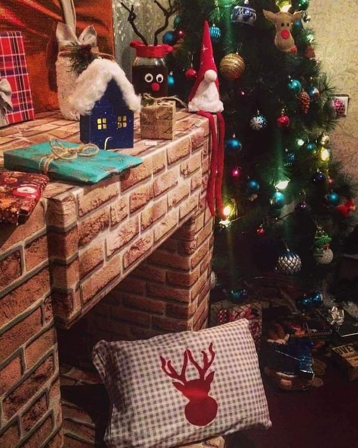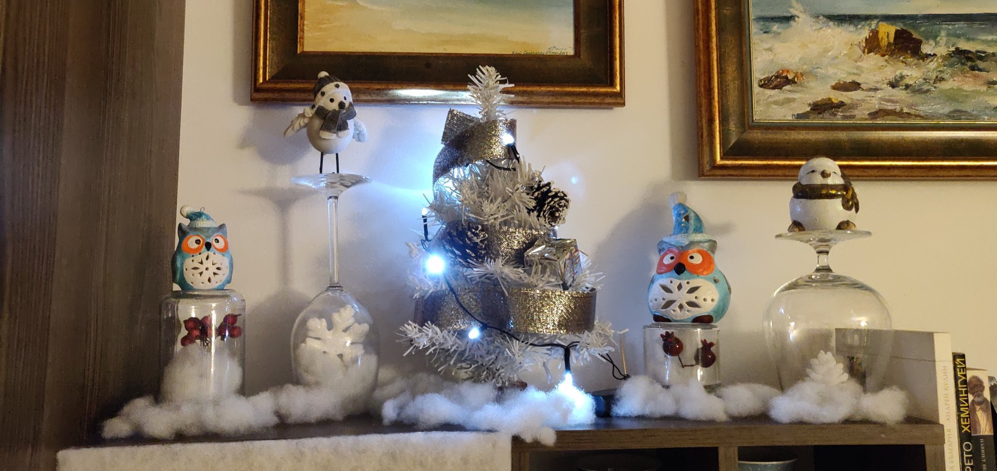 В хола на секцията ще е горе-долу така, но тази малка елхичка за втори път я пренареждам и пак не ми харесва. Мъжът има идея как да стане, но няма време в момента, така че там ще търпим вариации: