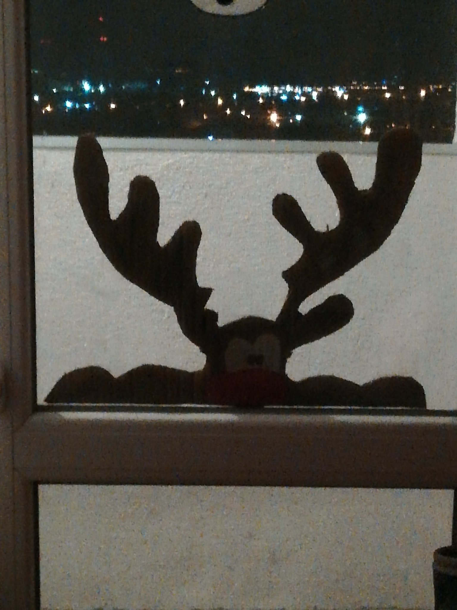 Лепенките на прозореца! любими са ми, пазя си ги трета година, сигурно ще е последна. Но аз съм взела три-четири еднакви. В основата на прозореца един плътен ред къщи, над тях летящи шейни и най-отгоре звезди и снежинки, приказно е ❤️
