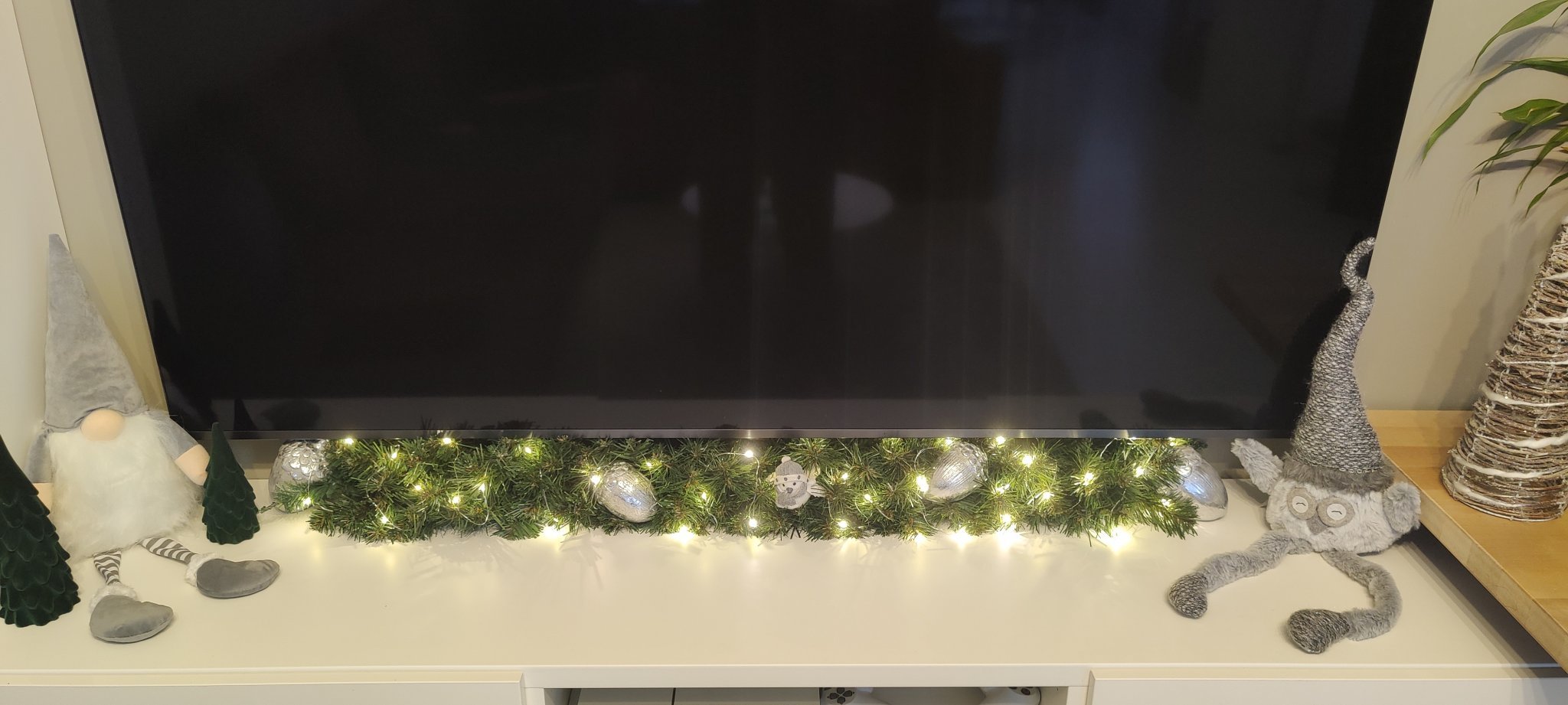 Показвам и украсата под телевизора, доста по - ефектно е вечер. Лампичките и жълъдите са от Юск, а герляндът от Бриколаж - много хубаво стана, според мен. ☺️