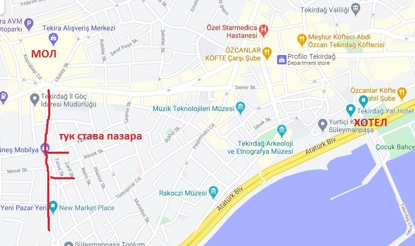 След Лозенград следвате табели за Бабаески, след това Люлебургаз по път D100(мисля беше). Това е пътя за Истанбул (безплатен), има отбивки в дясно за Текирдак. Спали сме в Tekirdağ Yat Hotel с изглед към морето.