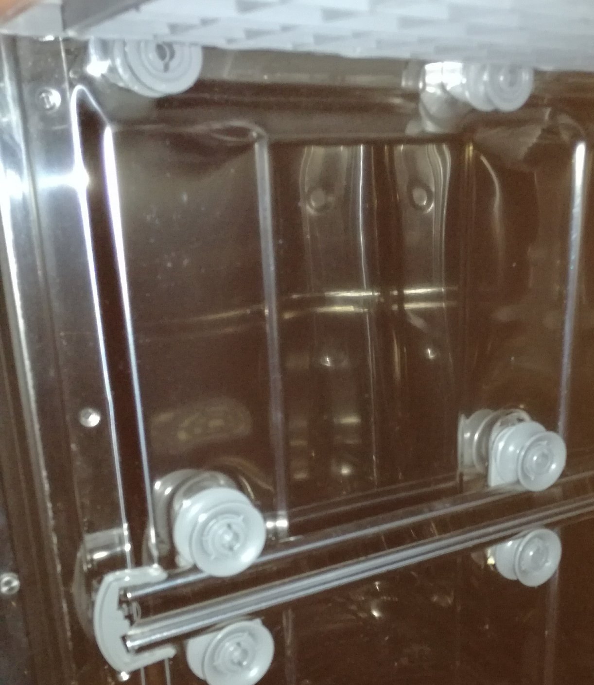 Така. Днес случайно намерих упътването на машината на немски, имаше и опция бг. Преведох го, направих екранни снимки. И тръгнах да сменям мястото на втората кошница. То тези водачи, телескопични ли се водят, те са едно менте с извинение. Самите водачи не мърдат, на горните от двете ролки уж трябва да седи кошницата.