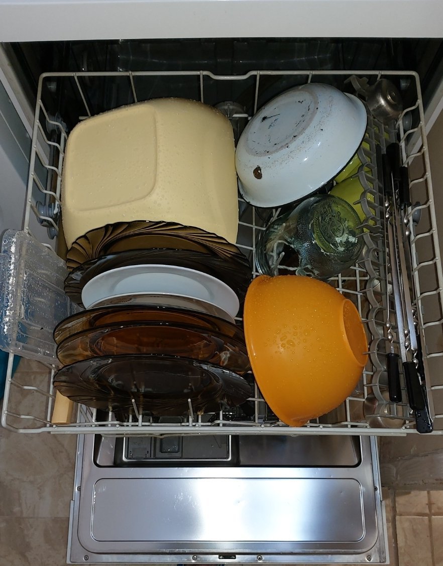 На мене с моите 5л тенджери ми се заема половината кошница. А да събера и голяма тава с нея е абсурд. Кошницата пък за приборите ми се разделя на 2 по тънки кошници и обикновено ползвам само едната, като я тикам където ѝ намеря място. Капачки слагам в горната кошница. И да подскачат не ми е драма, а горе перка няма, че да се заклещят и да стане някоя бела.