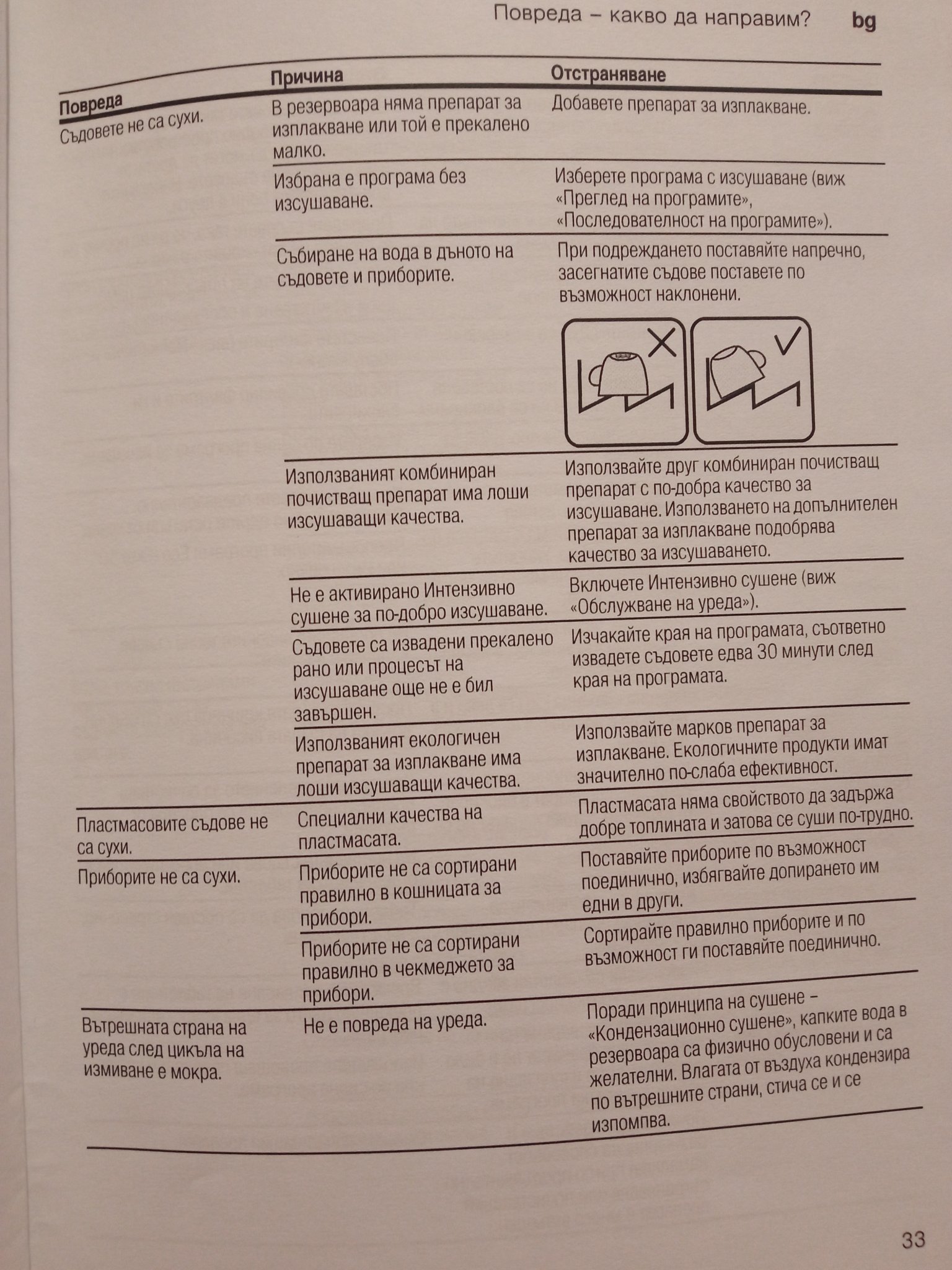 Трябва да се включи активното изсушаване. И при нас беше така с първите няколко пускания - имаше капки. То удължава с 20-30 минути цялата програма, но излиза всичко сухо. Програмите са общо около 2:20 ч.