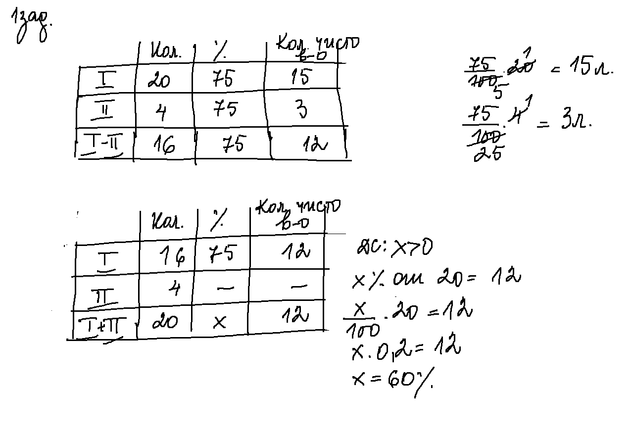 От 20 литров съд, пълен със 75 %разтвор на спирт във вода, отлели 4 литра и долели съда с вода. Процентното съдържание на спирта в получения разтвор е: