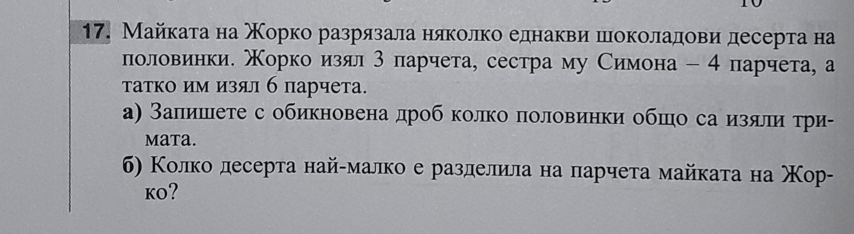б) 13/2 = 6 1/2  => Майката е разделила най-малко 7 десерта.