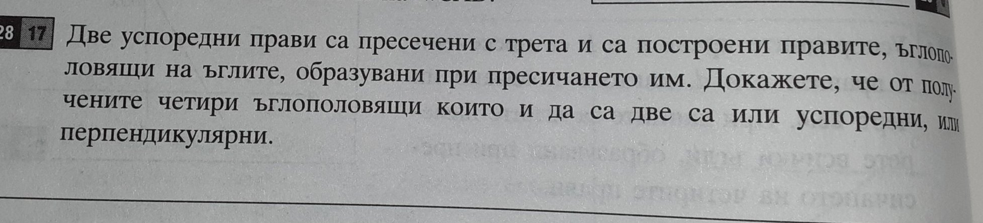 В синьо са ъглополовящите, а в черно са успоредните прави, пресечени с трета.