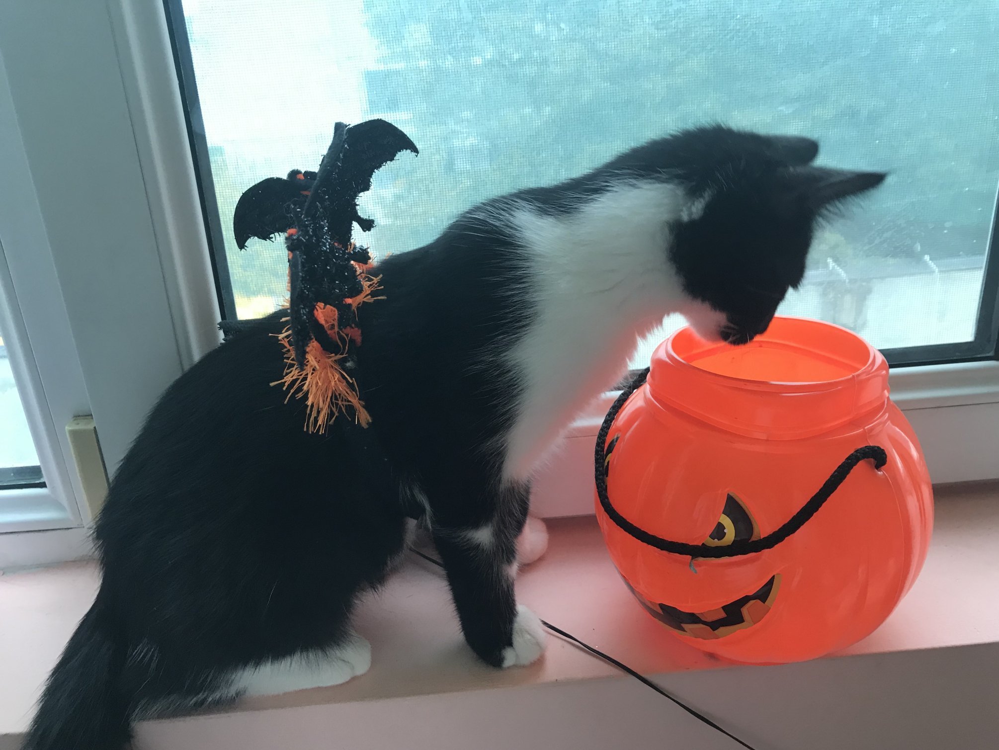 Аз съм пуснала една гирлянда пластмасови оранжеви прилепчета през парапета на терасата на 2 ет., и Барни по цял ден ги дебне през прозореца Simple Smile.