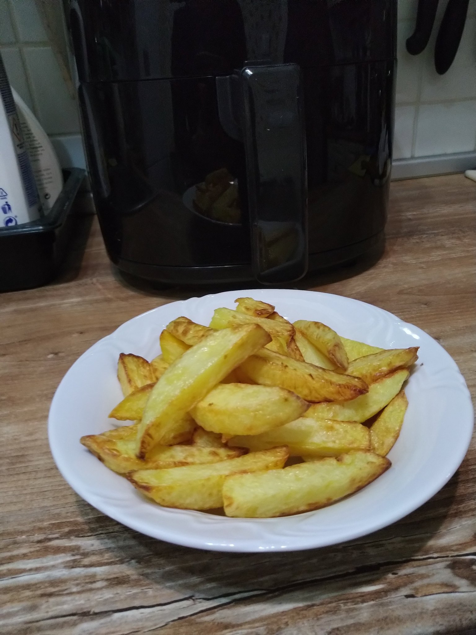 И Аз се уредих с една бройка,като прочетох за пушенето се уплаших малко,имах 3 картофа нарязах ги на едро защото така ги обичам. Пушек нямаше, картофите станаха по моя вкус.