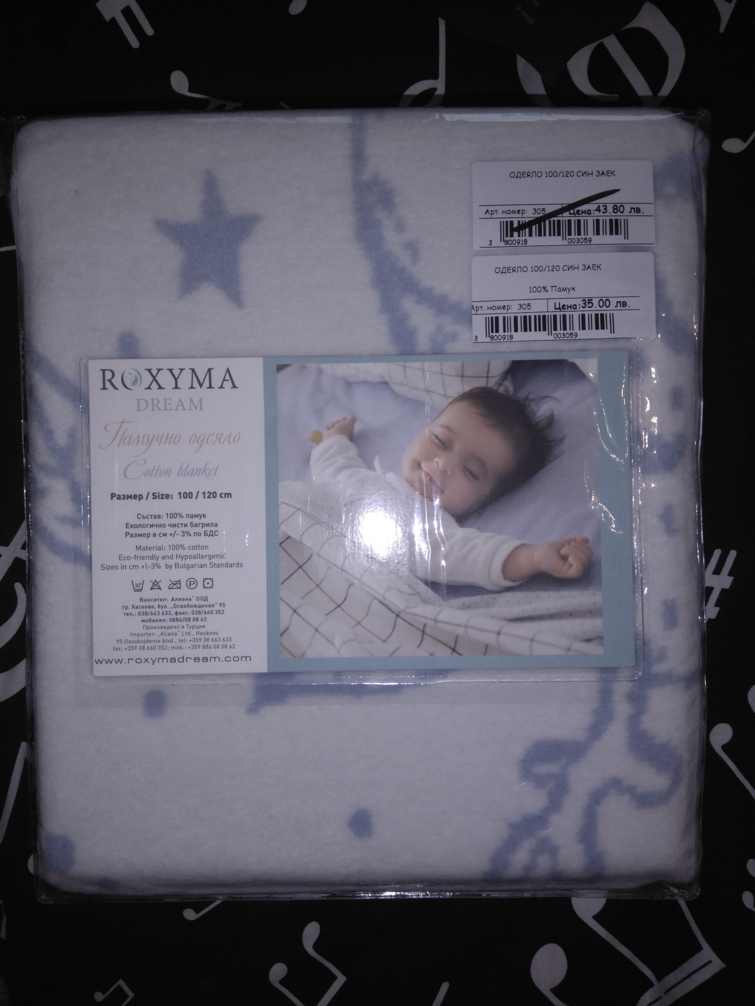 В Роксима Дрийм взех страхотно дебело меко одеяло, памук, 100/120 и ще става и за дълго ползване. Много е мекичко...дори след години може да се ползва например при пътуване в колата.... Много се радвам, че се сетих за тази фирма. На етикета пишеше, че е с картинка зайче, а се оказа еленче. Още повече се кефя, защото сме Козирог и двамата и това козле с рогца е като коледно еленче.....