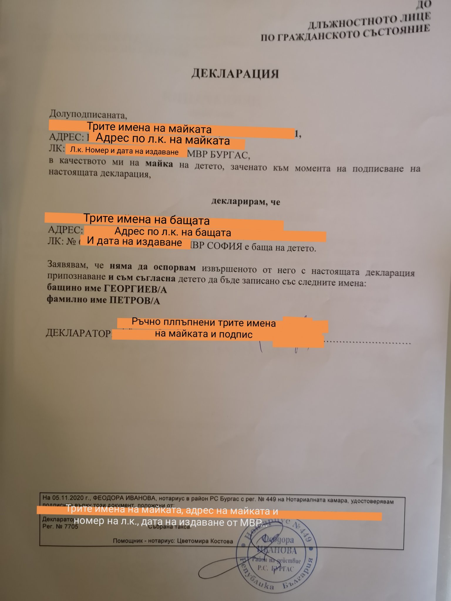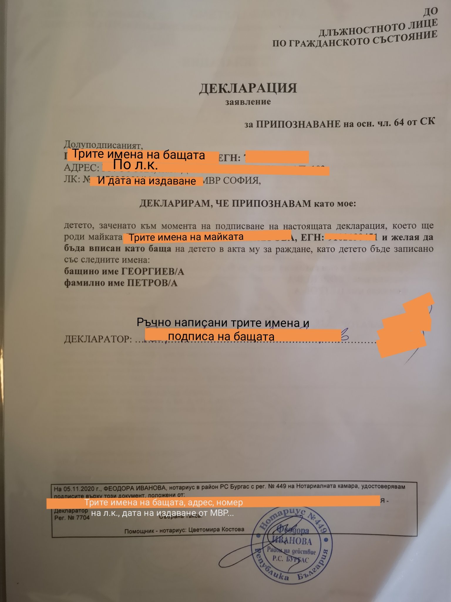 Момичета, ние подготвихме предварителна декларация за припознаване на бебка при нотариус, за която услуга заплатихме 24 лв. Разбрах, обаче, че ако се отиде с готова декларация, която нотариусът само трябва да завери, струва доста по-малко.