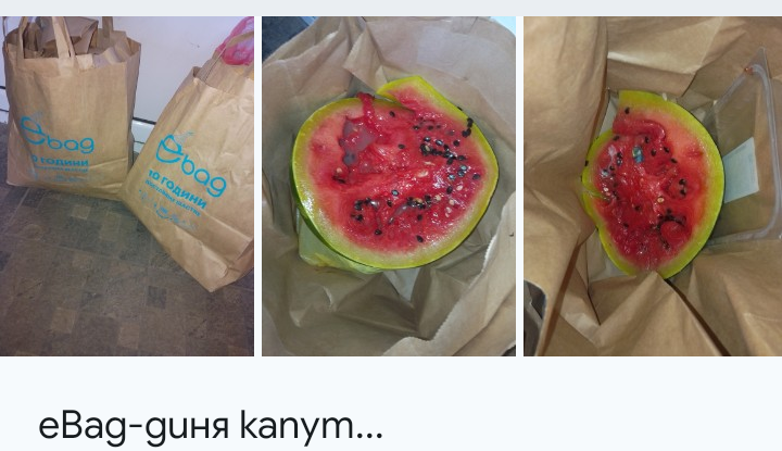 Поръчка вчера  Понеделник.-28.07.2028 следобед от ...eBag... ни изненада на другия ден , днес 29.07.2025 със недопустим ужас за изхвърляне. Ужасът (разплута диня крепяща се на втечнена кора) бе залял всичко с размер на два легнали плика ..eBag .Такова сплуто хранително отровно чудо не трябва да се допуска за продаване. Проверете входящ контрол доставка, съхранение и задължителен изходящ контрол при доставка клиенти. Добри сте , но това недопустимо нещо е живото-застрашаващо и няма компромиси.