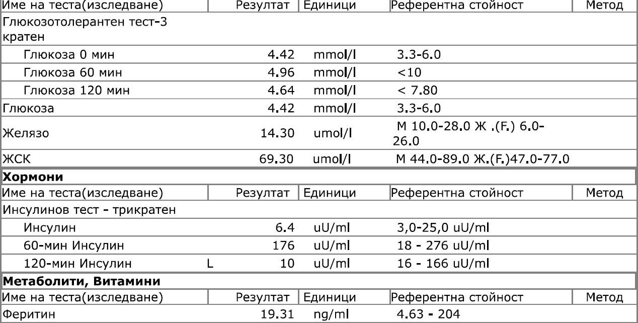 МОД91, dolce miele ти е обяснила за желязото. Захарта ти е идеална, инсулинът на гладно също и това е важното. Също е добре, че на втори час инсулинът ти влиза в норма. На първи час е отвратително висок, но понеже всичко останало все още е наред, до 2-3 години ще си като нова. За толкова успях аз, а при мене беше 190 на първо час. Да, имаш ИР и затова инсулинът ти скача.