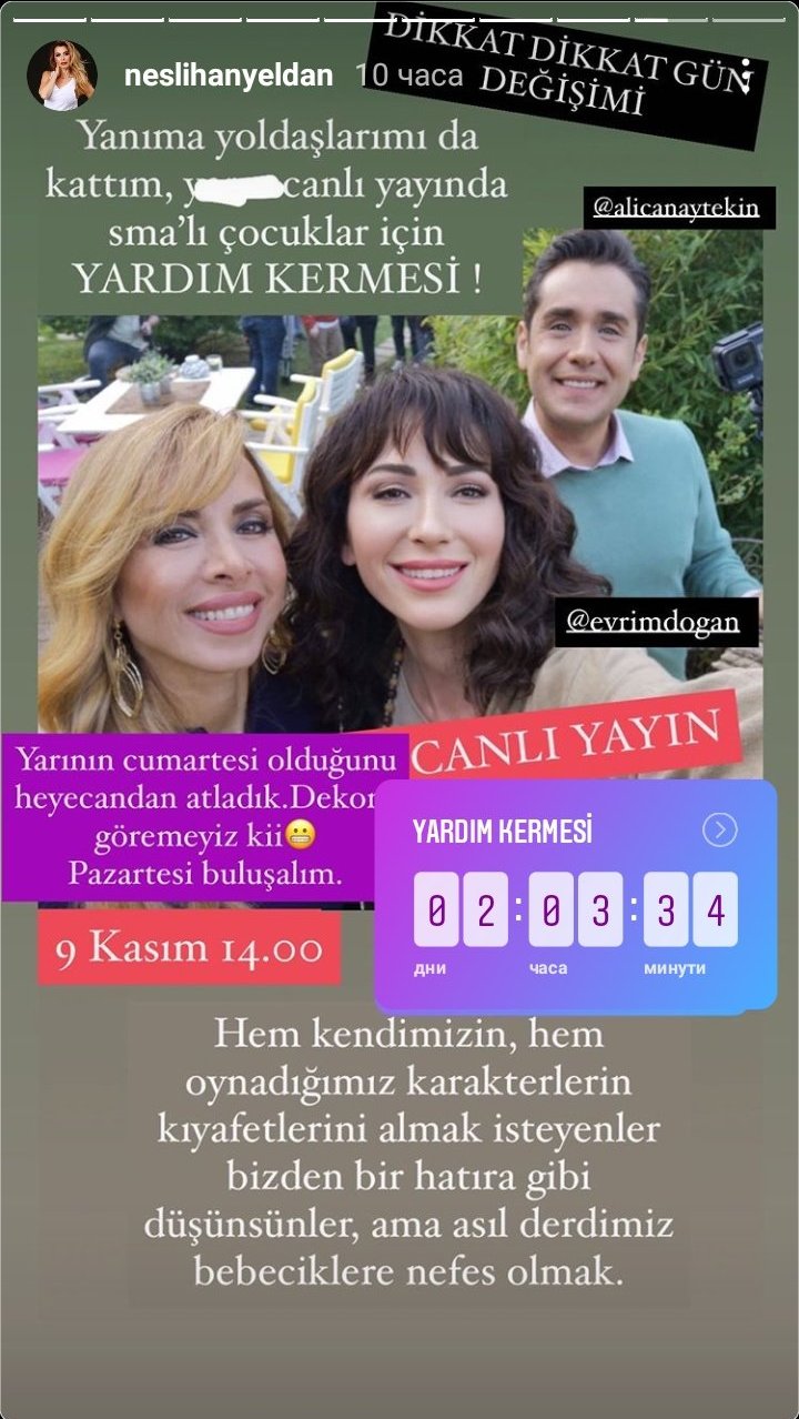 dariVale това е деня на който ще има включване от сета с Еврив Неслихан и Алиджан .Снощи неслихан го беше качила в сторито си че това  ще е за днес но след това е сменено с понеделник,а за миглите като разбера ще пиша.
