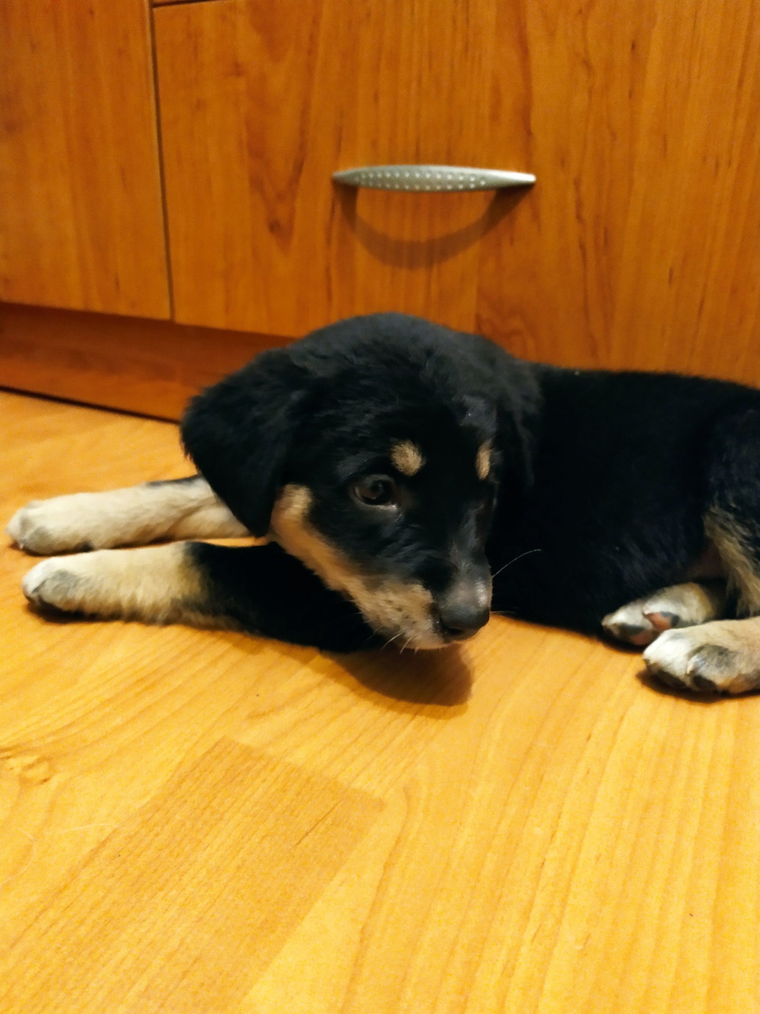 Това бебе тичаше след хората, първо след възрастна двойка, после след майка с дете ...  Накрая се сви под една току-що спряла кола и почна да плаче. Не издържах, ревнах и аз и с мъжа ми го прибрахме за вечерта у дома. Не можех да си представя да стои на минусовите температури навън през нощта. Тумбакът му беше пълен, не яде много вкъщи. Изкъпах го и му дадох четвърт милпразон. Не видях бълхи по него, но на сутринта изкара глисти. Заехме се с намирането на дом. Не можем да го задържим. Просто ми е невъзможно второ куче. Женско е. На около месец.