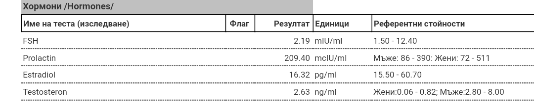 Провери Кортизол, Пролактин, Андростендион, Тестостерон, ДХЕА, 17ОН Прогестерон ( на 3 ден от МЦ)...