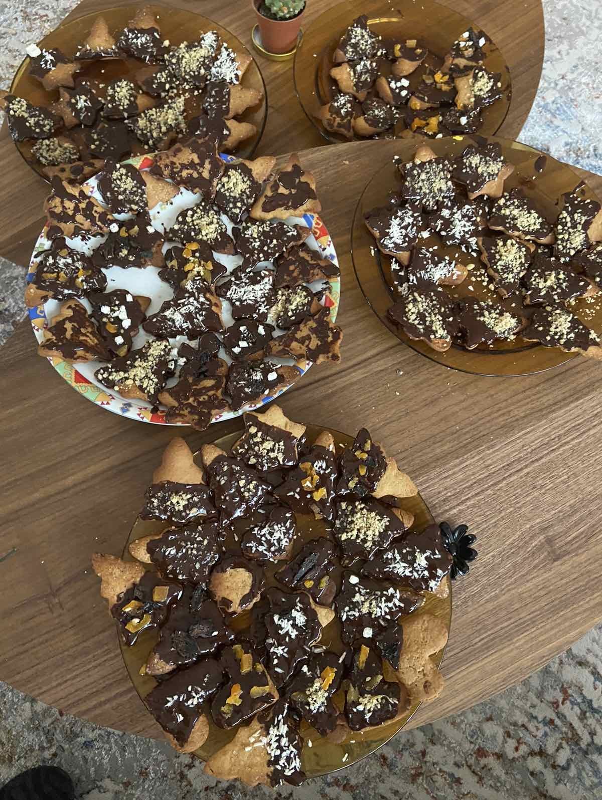 Започнахме вкъщи с направата на коледни сладки. Първите украсихме с шоколад, кокосови стърготини, смлени орехи и сушени плодове, нарязани на дребно: