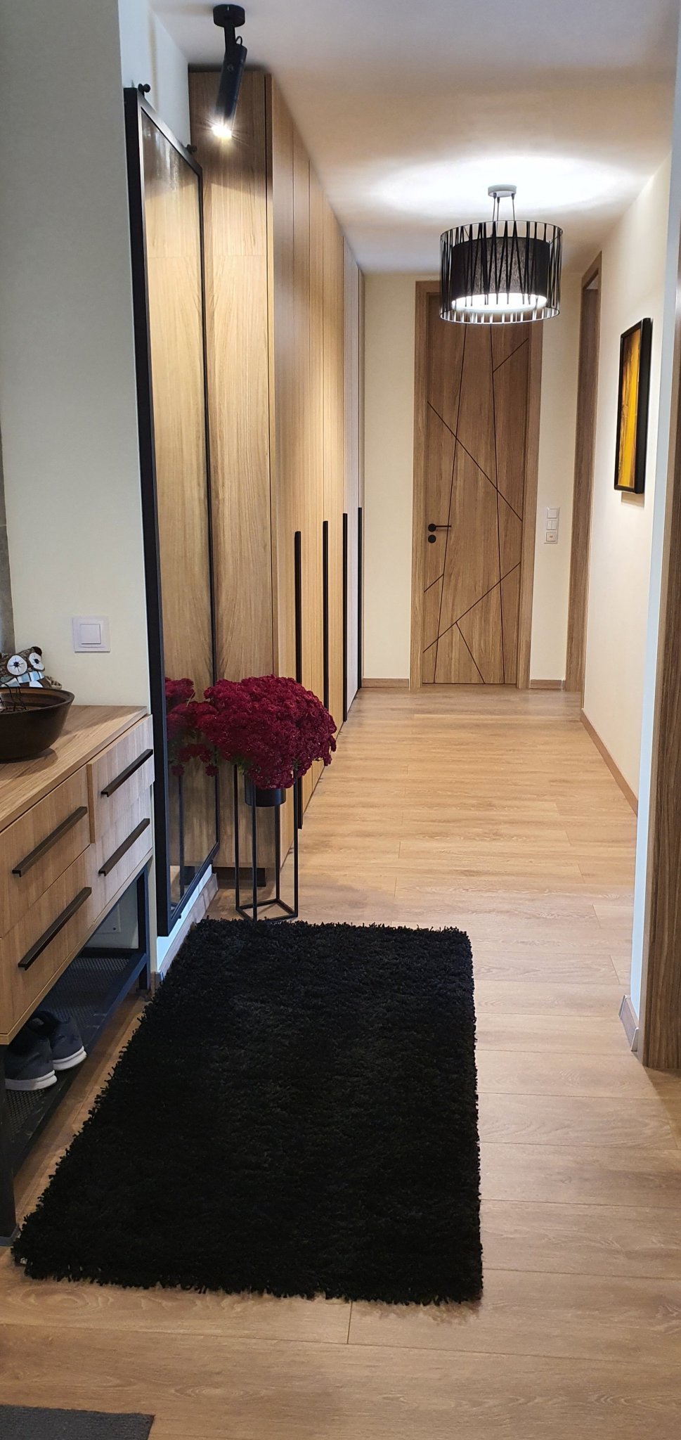 tomeva, много ми харесва у вас. Постигнали сте  стилово обединяване между отделните помещения посредством еднаквите настилки, фладер на корпусните мебели и вратите. Същевременно цветните акценти в текстила и тапицираните мебели придава едно усещане за "мек",  минимализъм с индъстриал осветителни тела. Браво!