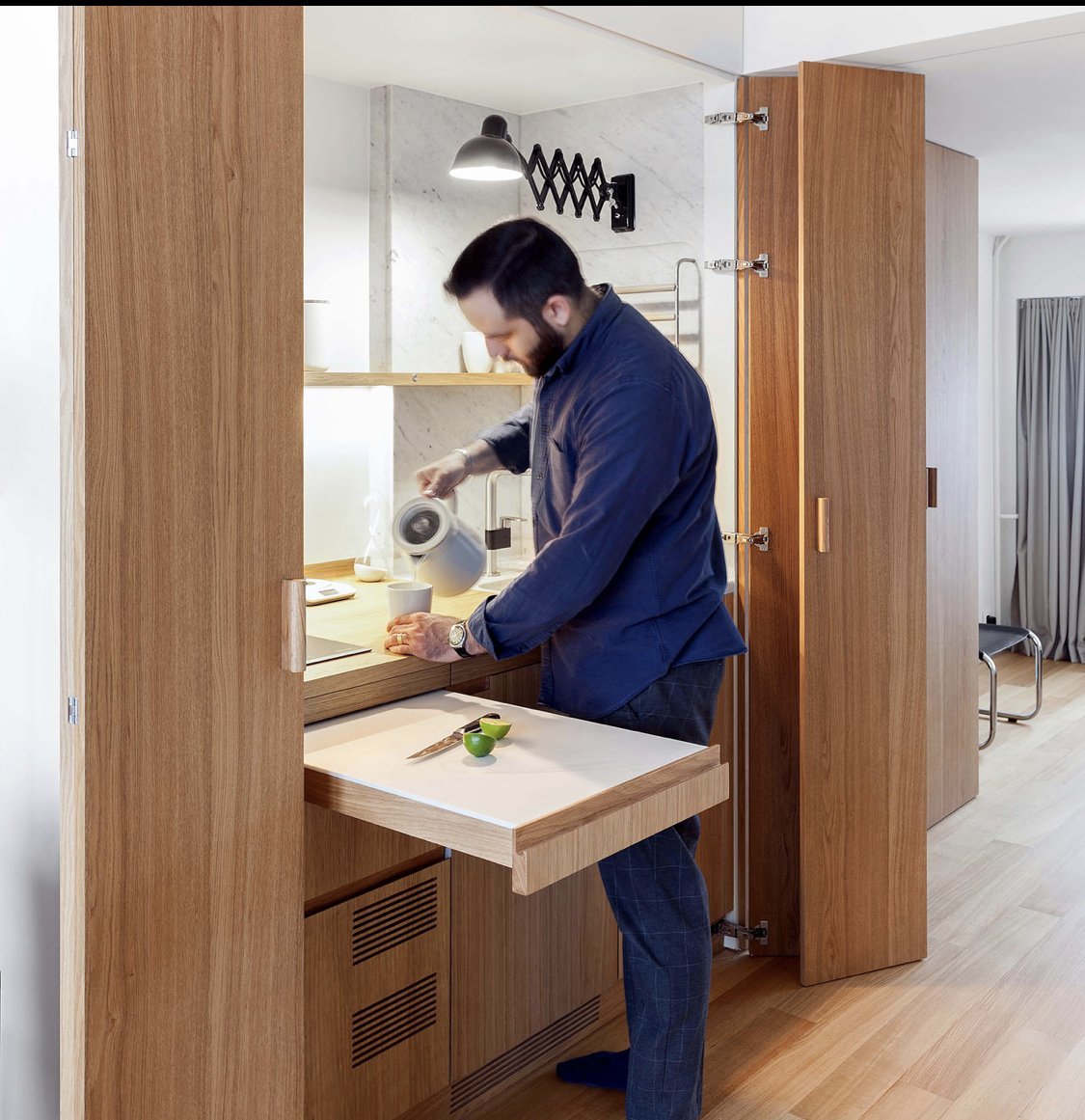 Скоро имаше публикувана една кухня с подвижен шкаф, който играе ролята и на остров. Друга идея е плитък шкаф под прозореца, зад масата. Там ще може да прибираш някои неща, които ползваш по-рядко