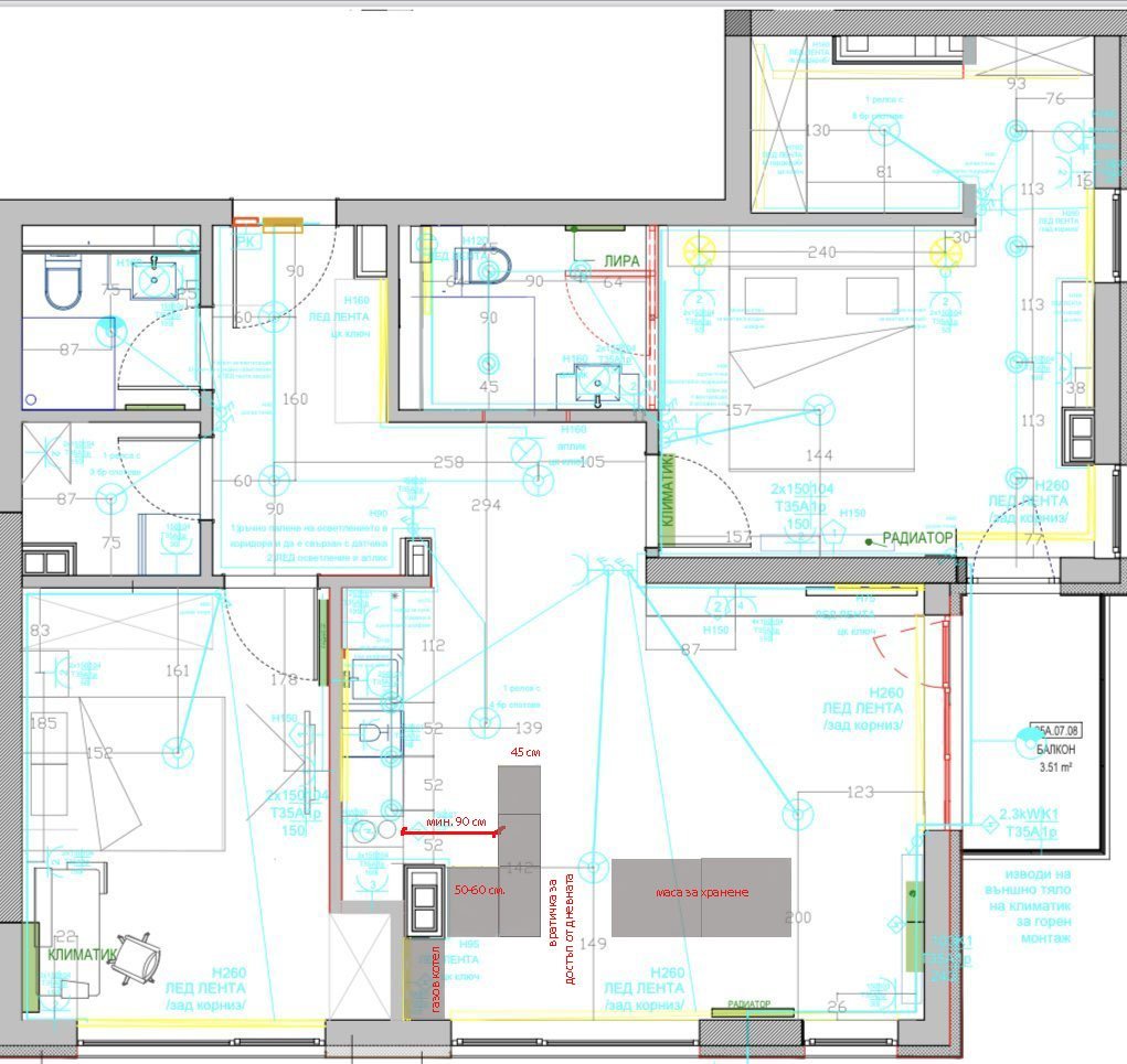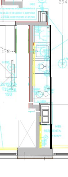 Може и да не се завърта плот пред кухнята, а само 2 ниски шкафа до вертикалните щрангове (общо около 90 см. свободен плот)