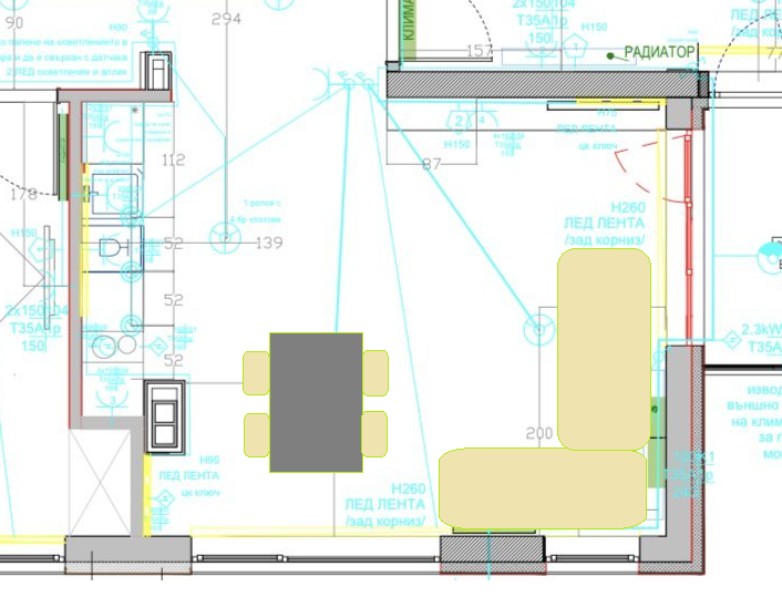 Аз в началото исках трапезарната наса да е в другия край, до терасата.. но така дивана би гледал срещу острова и установих, че ме дразни, за това преместихме масата в ляво, а дивана срещу кухнята.