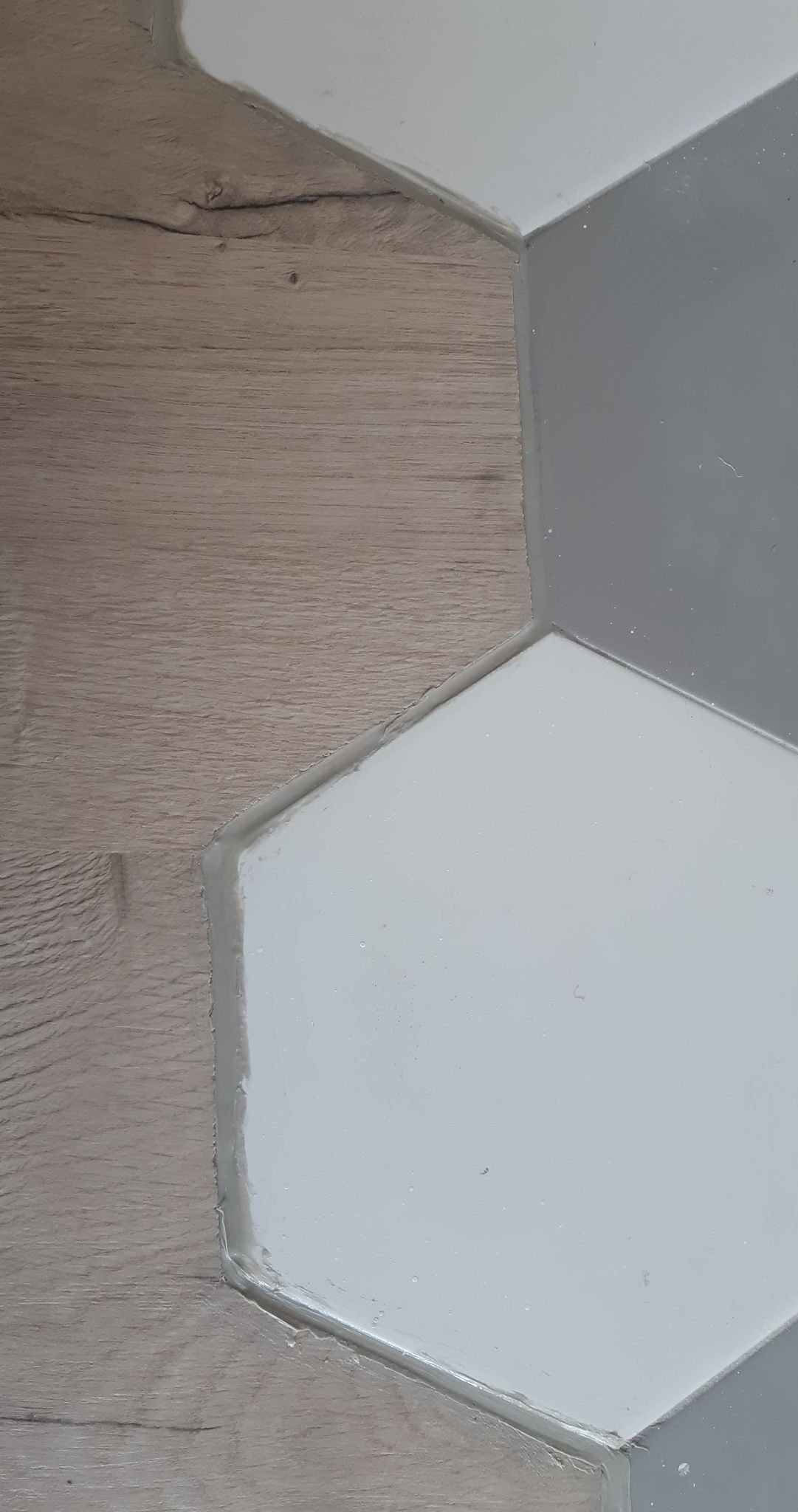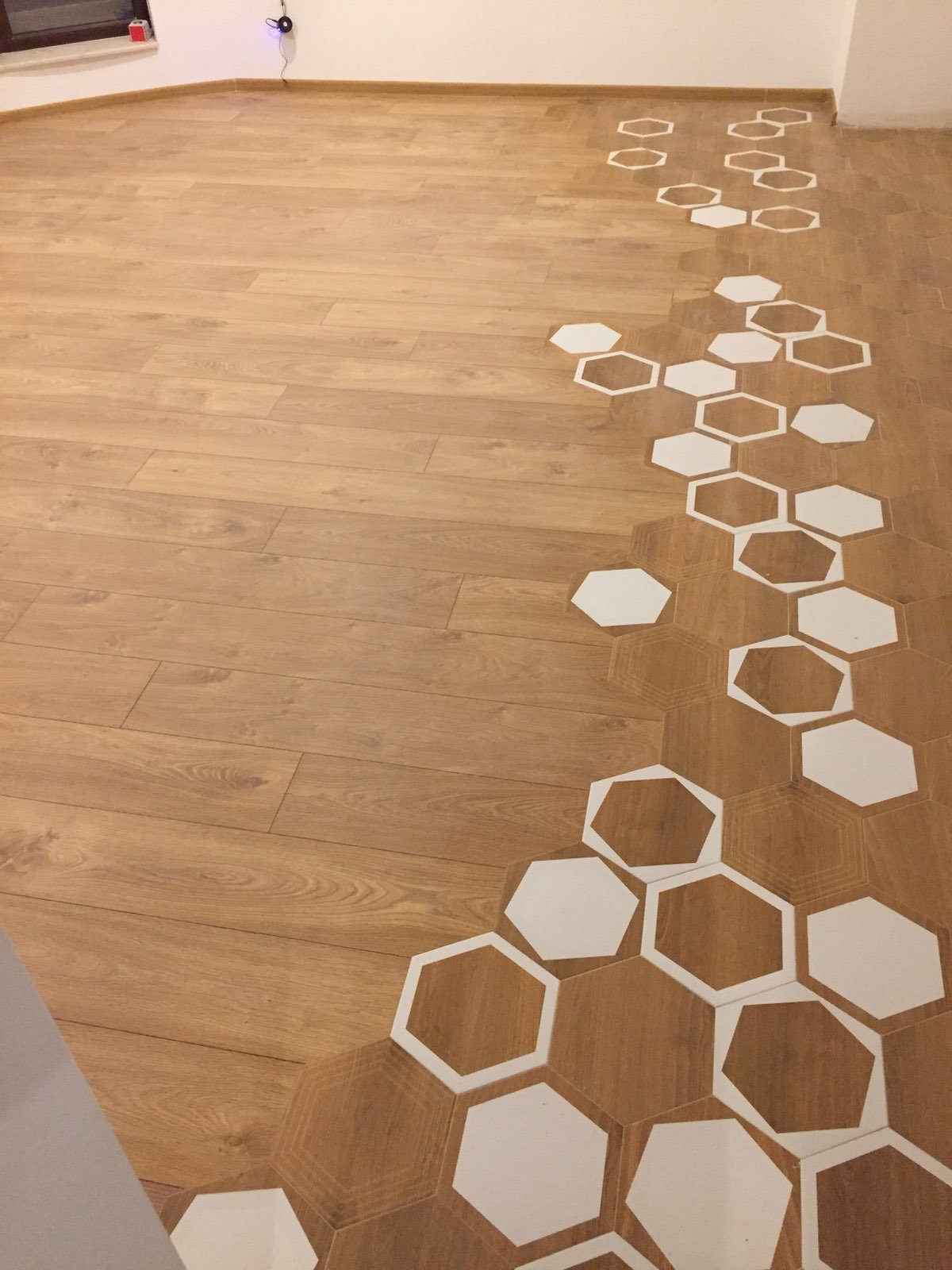 Наехме майстор да сложи ламиниран паркет, като има на част от кухнята и плочки с шестоъгълна форма. Няма преходна лайсна, а сами ефуги са запълнеи със силикон.