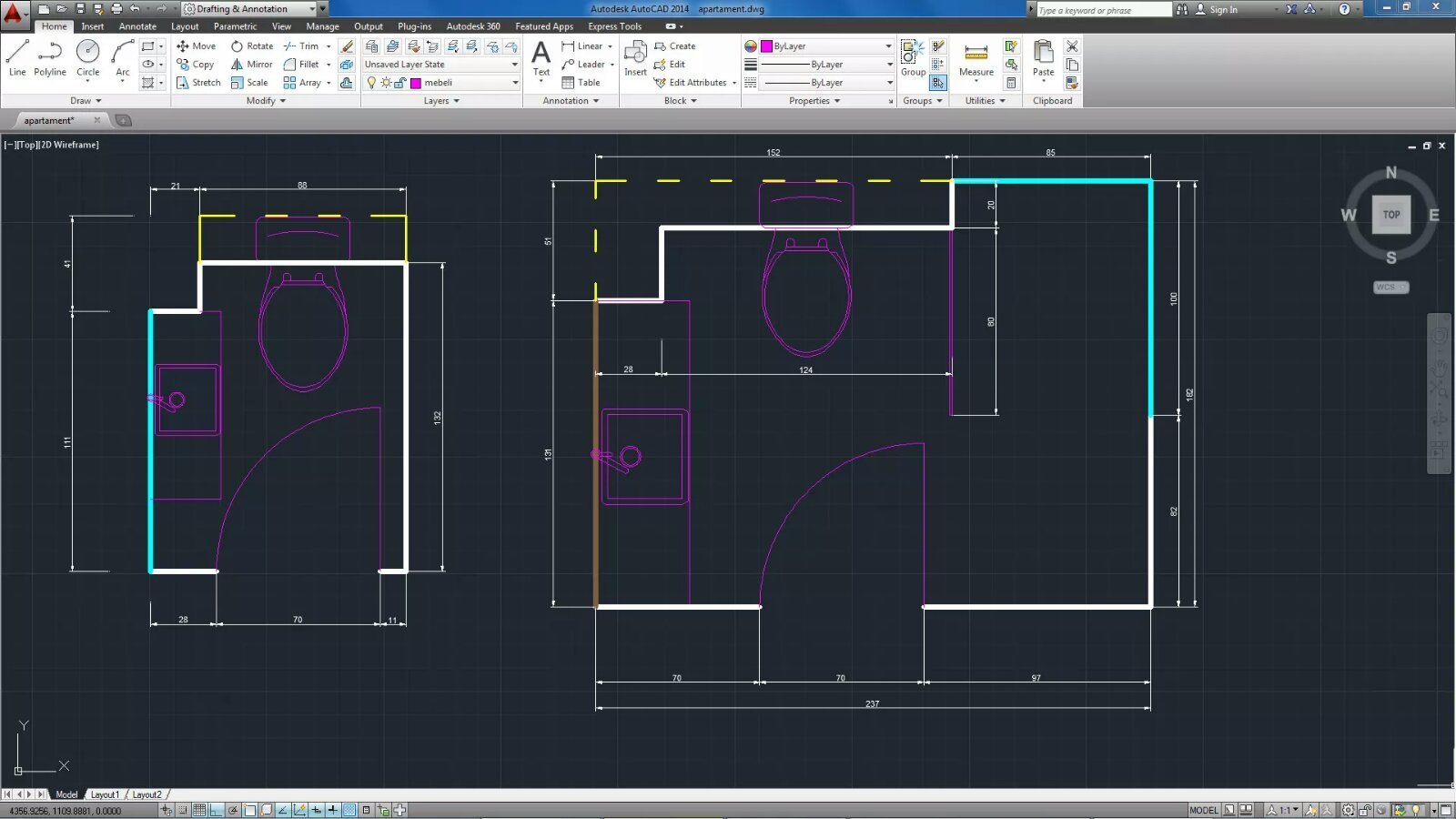 Прилагам идейните ни чертежи и бих искала да се допитам до вас за банята, като правя уточнението, че по чертежите с бяло съм отбелязала - светлия цвят плочки, с кавяфо - тъмния, а със синьо - тези, които са като музайка. Освен това, над вградената структура на казанчето предвиждам ниша, чийто гръб ще е от музаечните плочки.