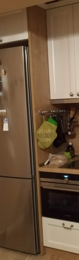 Аз до хладилника имам вертикала в цвят като гръбчето но от ПДЧ кантирано. Хем не цапам хладилника, хем нищо не пада, а и кухнята ми изглежда завършена.