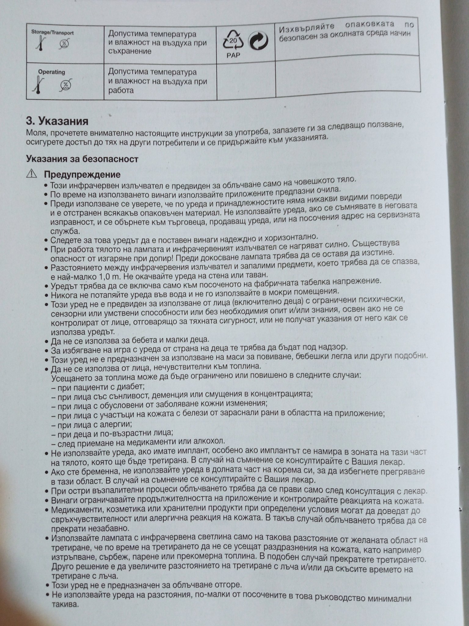 Мисля, че на крушата пише Филипс 100 вата (консуматив е). Използва се от разстояние, не трябва да е близо до кожа/тяло, има опасност от изгаряне. Нищо не пише за минути на употреба, нищоооо....Има защитни очила в комплекта т. е. трябва да се пазят очите! Лидълският масажор го опирам навсякъде- чело и т. н. Нищо общо нямат. За синусите или при болки в ушите можеш да пробваш и лидълските джобни грейки с пластината.