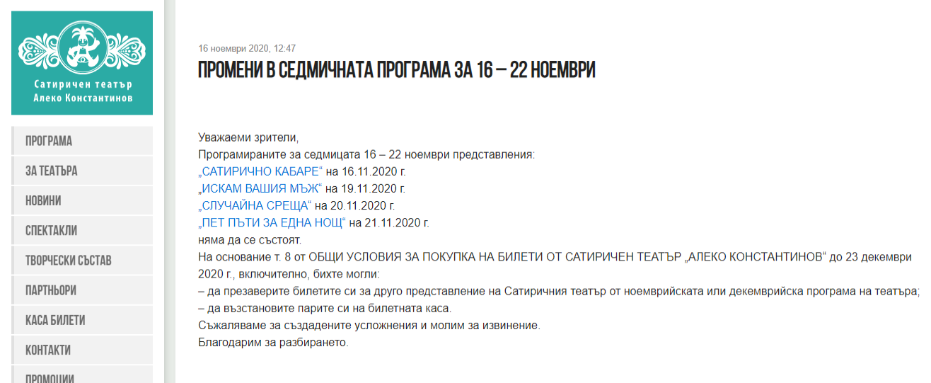 Между другото в темата за театъра една потребителка се оплаква, че точно от Сатиричния театър на два пъти са променяли дати за представления кажи речи в последния момент и като причина изтъкнали, че нямало достатъчно закупени билети и не им било рентабилно. Това по повод, че все пак може да има и други причини за отмяна/ отлагане на представление.