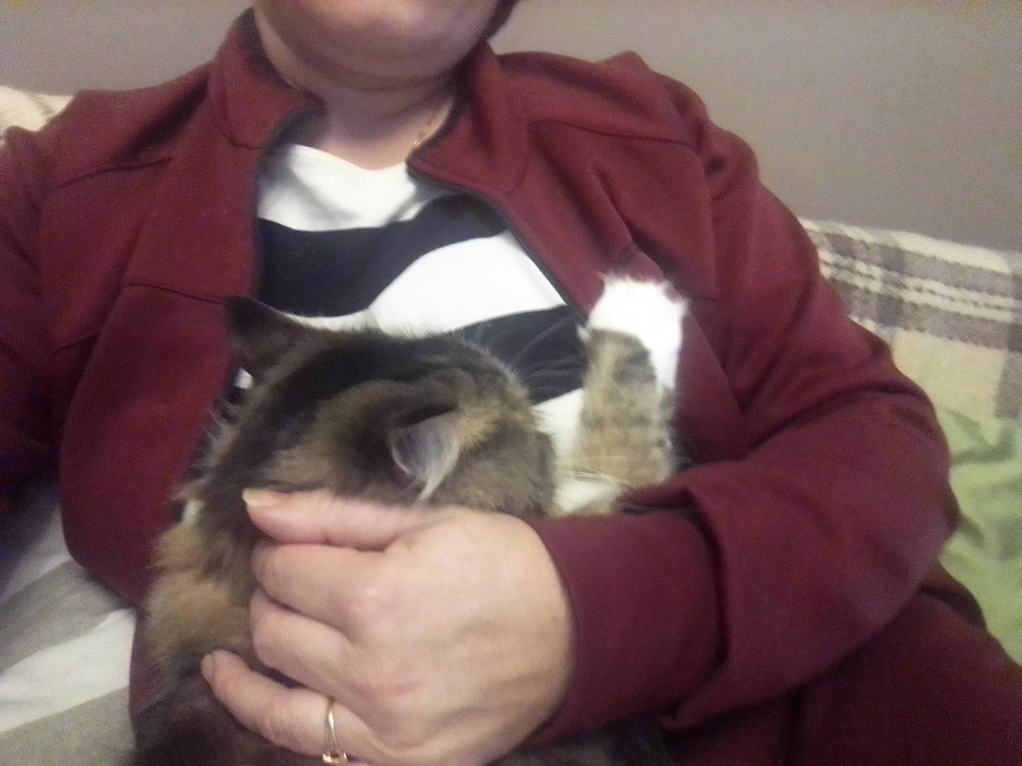 Аз гушканица да покажа, работя и котето усеща, че съм напрегната, дари ме с прегръдка от нейните и мърканица: