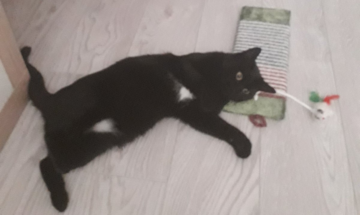 Бързо възстановяване на котчица, от мен една лежерна поза с полу-издъвкана мишка (почти) без пера