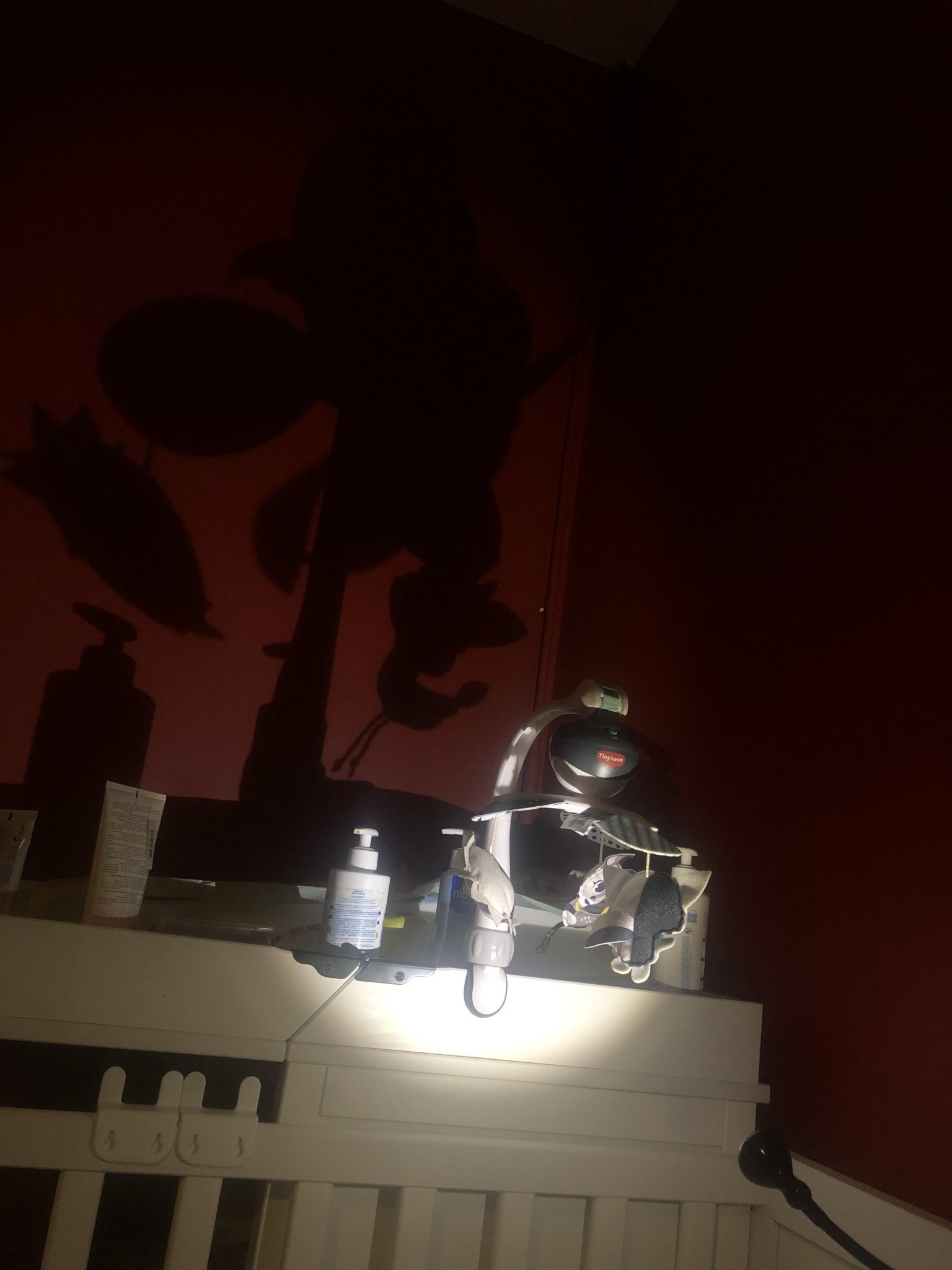 Въртележката и активната гимнастика са ни от черно-бялата серия на Tiny Love, но тя не е по-висока от други въртележки, просто шкафа на който е подложката за повиване е точно достатъчно широк да я закача до нея и тя я гледа с главичката настрани, не е над нея. Това което обаче най-много я хипнотизира е сянката на въртележката на стената, за което използвам на икеа от малките лампи за четене и я осветяван отдолу и така се “прожектира” на цялата стена, която е червена и затова много я влече. Нашата спалня изобщо се оказа създадена за зрителна стимулация на новородени - стени, пердета и мебели са ни в наситено червено, зелено и черно-бяло и тя много се заглежда.