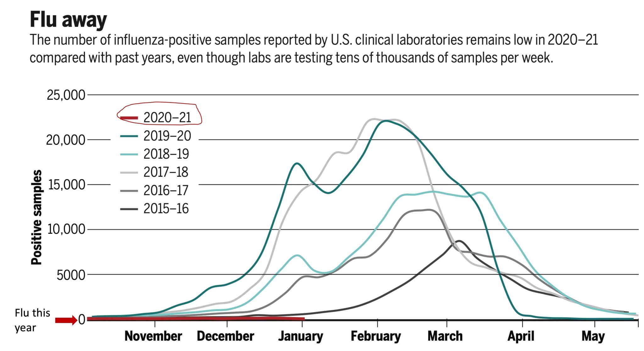 Червеното на графиката е положителните тестове за грип за сезон 2020-2021 в САЩ в сравнение с други години. Мерките срещу ковид се отразяват много зле на грипа, сега като се замисля по това време на годината в България обикновено е пика на грипната епидемия, но тази година май няма да има изобщо грипен сезон.