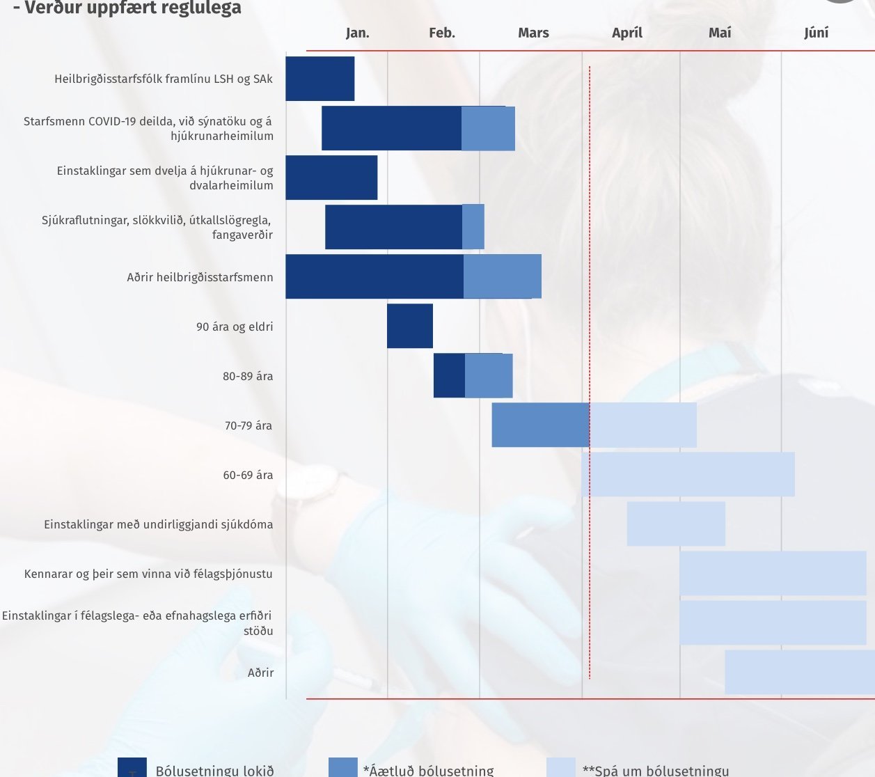 Знам, че има четящи тук, на които не им пука какво става извън тяхното село, и то ако тях лично не ги засяга, но това е планът и прогнозите за ваксинацията в Исландия по групи: