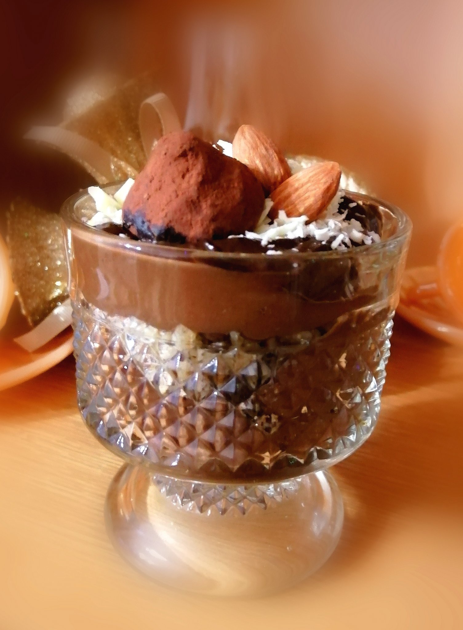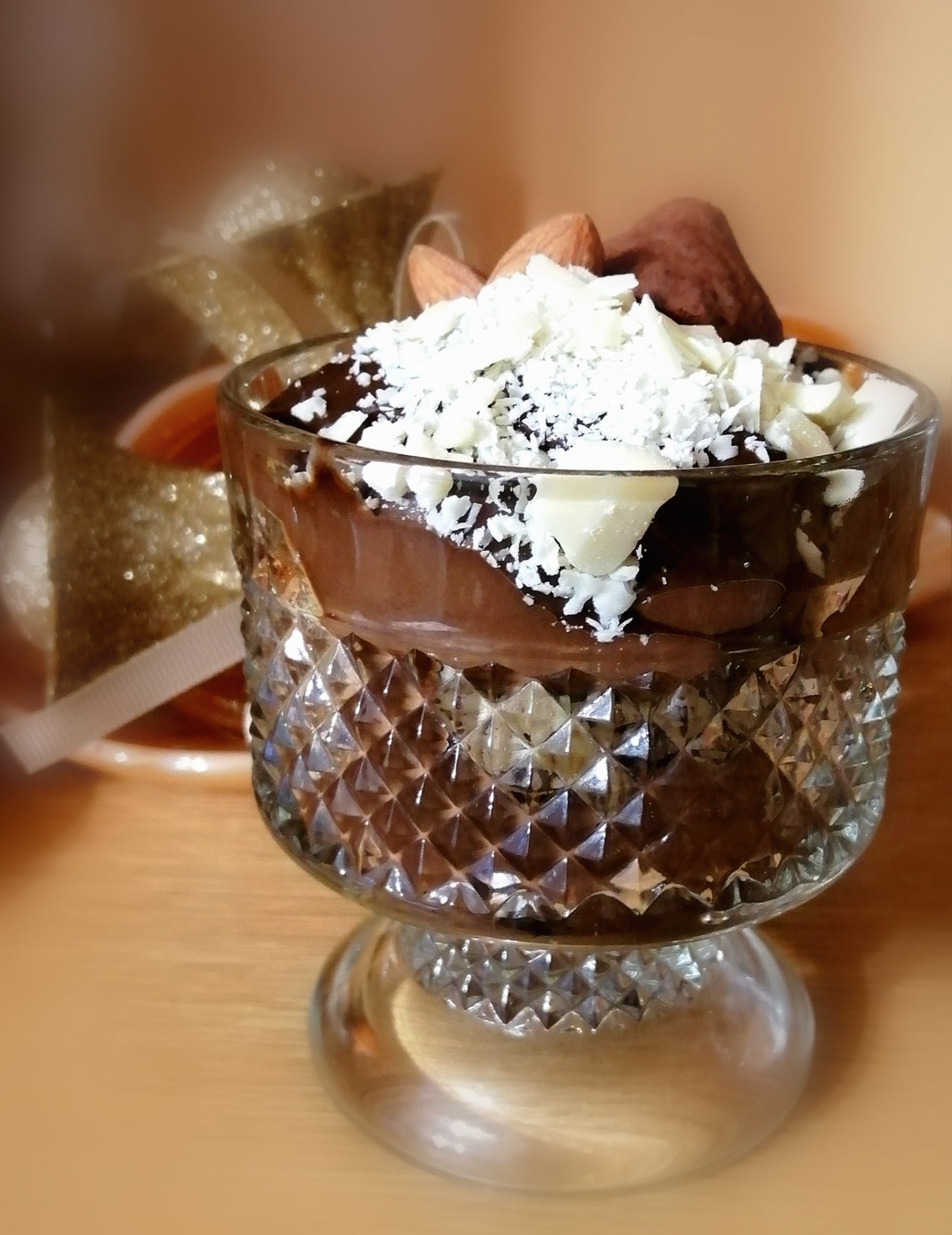 Шоколадов мус с авокадо и банан, гарниран с орехи, бял шоколад, шоко трюфели и бадемчета:
