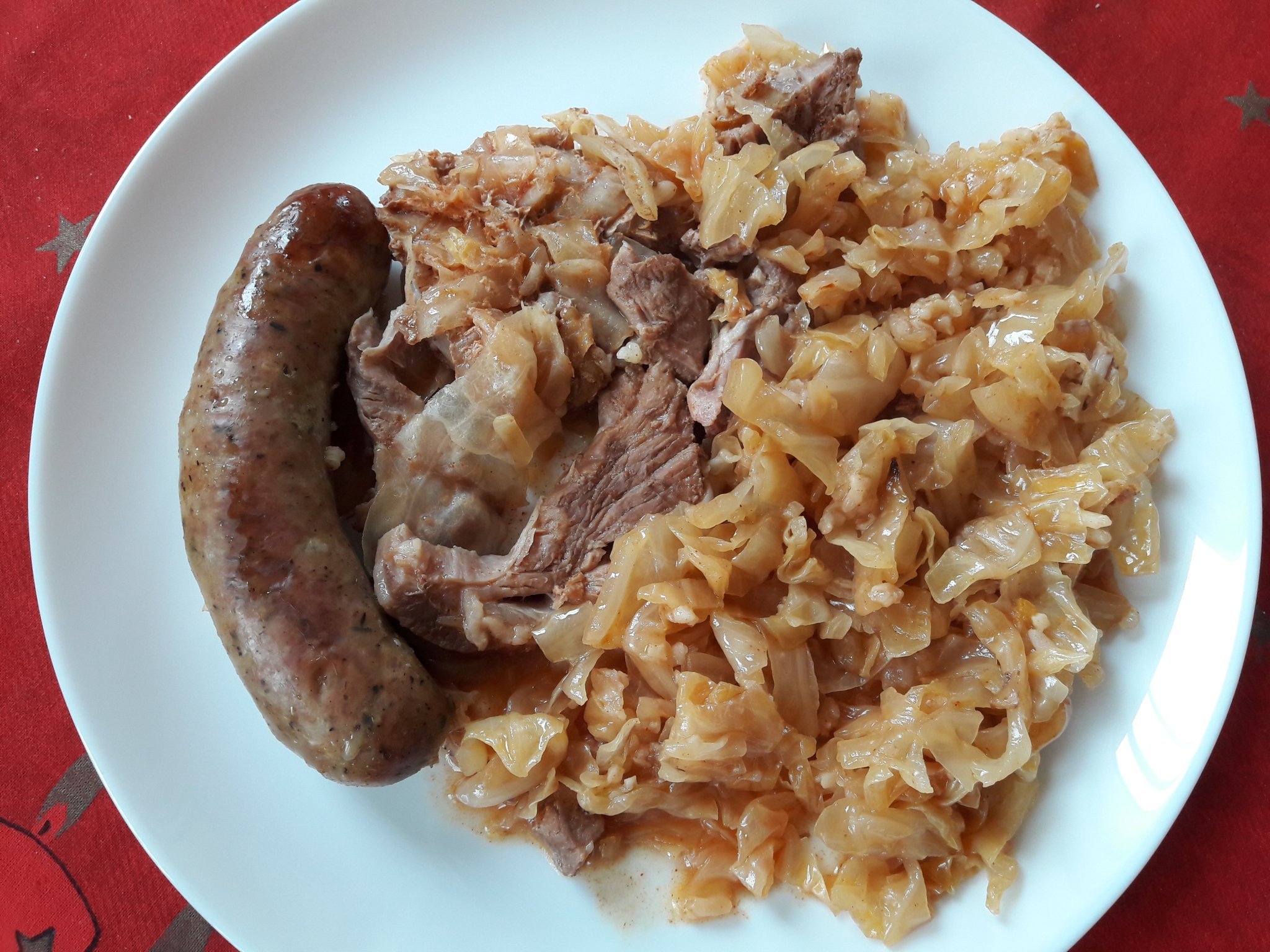 Свинско с кълцани наденици и кисело зеле в гювеч.