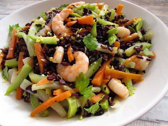 Черен ориз със задушени зеленчуци и скариди