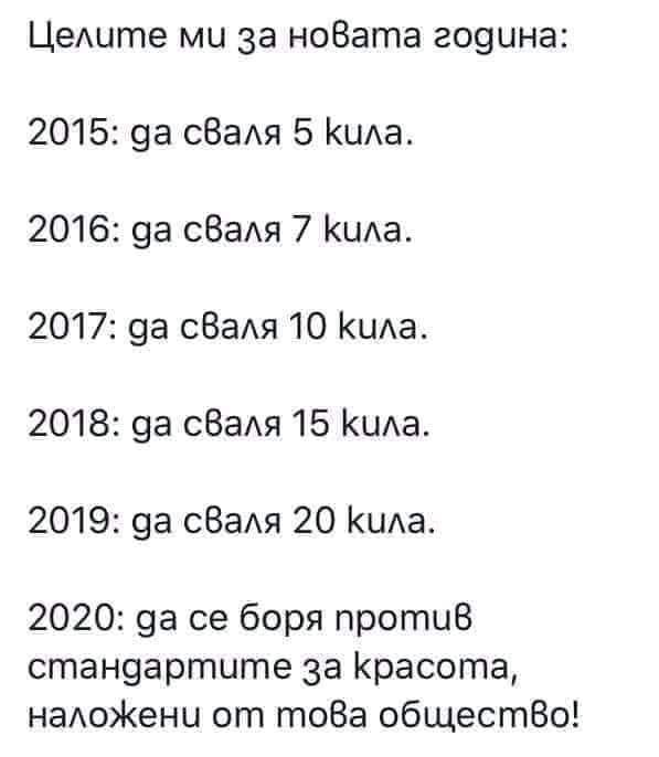 2. Ментални: ще приемам хората такива, каквито са, без да съдя, без да сравнявам. Ще приемам предизвикателствата, без да се плаша (тука много се съмнявам в себе си, ама айде). Няма да мрънкам за работата си. С една дума: приемам това, което не мога да променя и променям това, което не мога да приема.