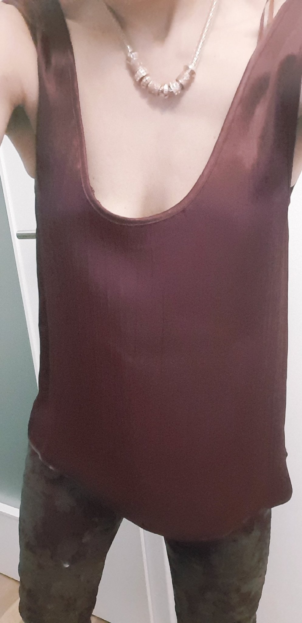 Виненият топ май е за панталон. Не знам дали промазани панталони се носят все още. Този никога не съм го носила, а харесвам монохром. С ток ще е добре.