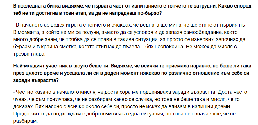 Да бяха се доказали в силови битки досега, не да си почиват. Не ми е интересно тепърва да разбирам дали дадени играчи са силни - имаха цял сезон да покажат качества. Но нищо не направиха. Ваня трябва да е на финал и ако е, ще бъде съвсем заслужено. Срещу кого - ами нека противникът да си спечели мястото. Но да видим какъв сценарий е измислен за финала. Нямам големи надежди и очаквания предвид некадърността на продукцията.