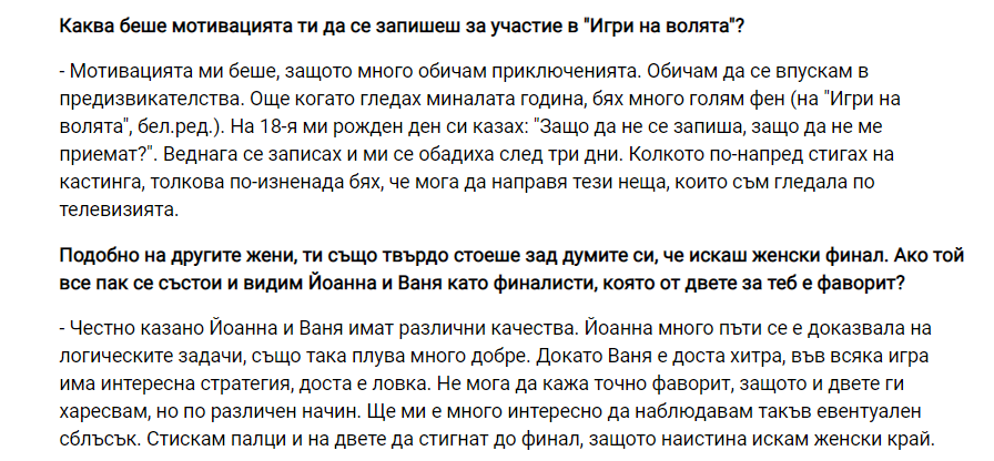 Аз да ви призная, искам мъжки финал. Не защото Ваня не е заслужила, а защото битката ще бъде силова, и ми се ще поне един път да се разбере кой е по-силен, як, издръжлив от Вайс, Боби и Милен. Мисля, че и те, мъжете там затова искат мъжки финал, заради битката на доказване, а не защото пренебрегват жените.Гледа ми се силова битка, а не чаршафи, плочки и пъзели.