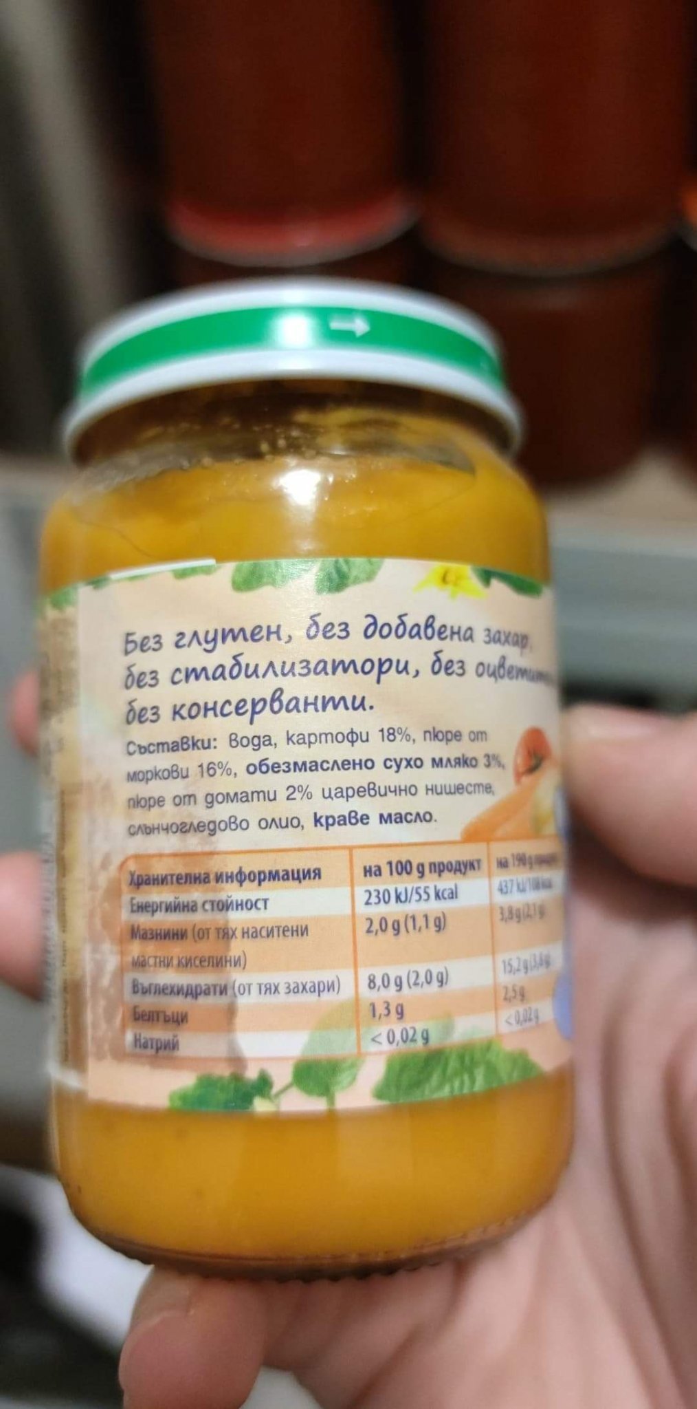 Следващото, което ще въвеждам е ябълка, банан , бананова и пшенична каша. А по натам ще видим... някой въвеждал ли е чушка? Препоръчвам пюретата на гербер- изцяло чисти без нишестета и захари. Купих на Ганчев за тест- картоф и морков...Ами то вижте какво има в него